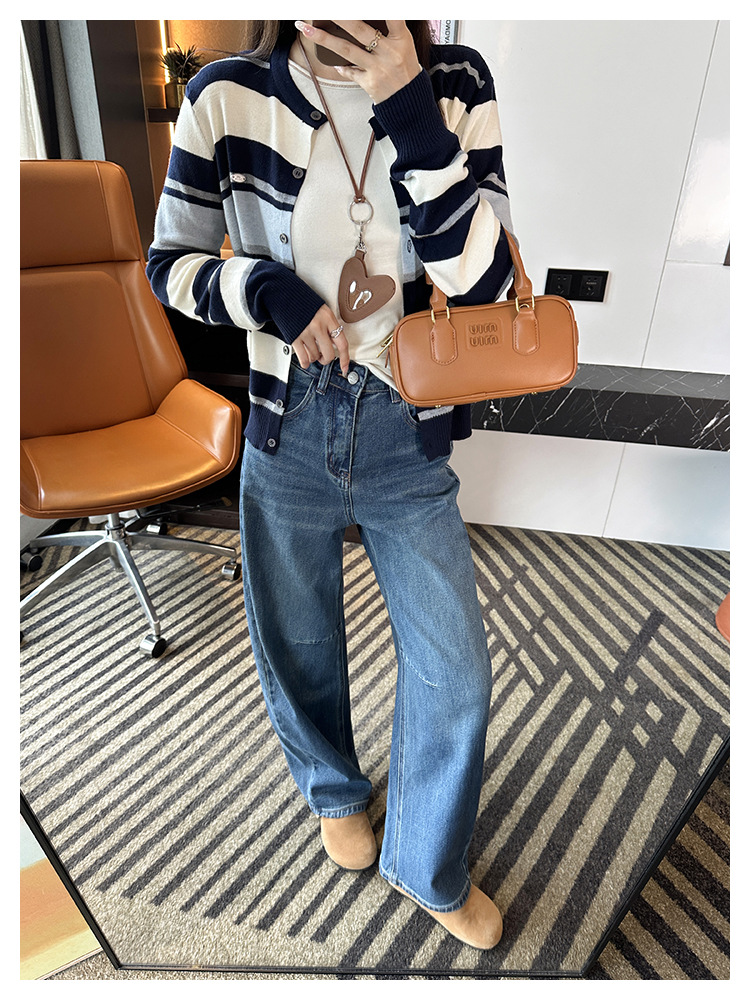 2025秋季新款圆领假开衫条纹羊毛毛衣长袖薄款高品质上衣外套