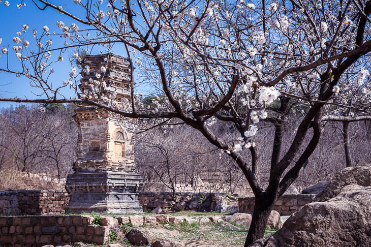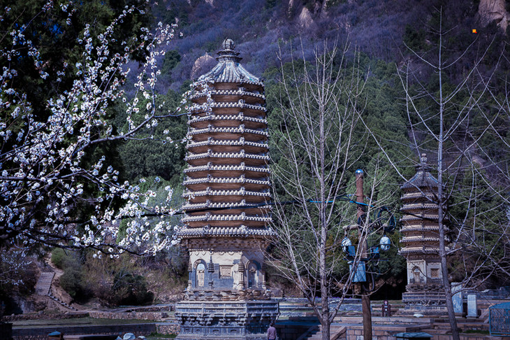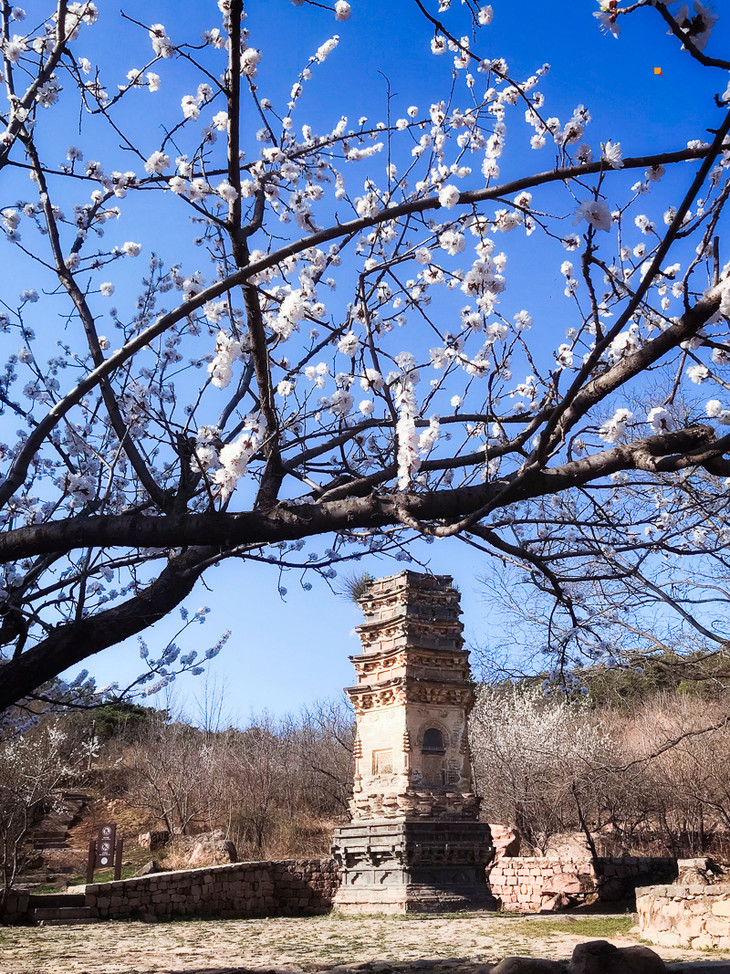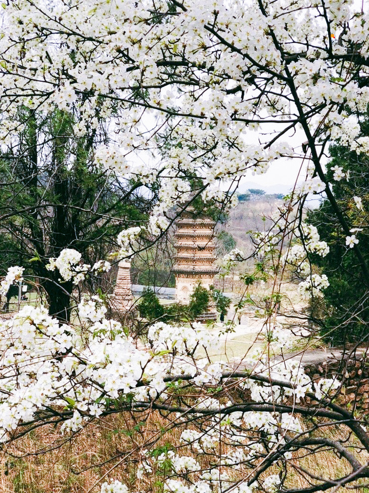 在春季花期的衬托下,古塔古寺也有了自己的温柔。历史古建筑周边被粉色的花点缀着,如同一幅水墨画增添了新的颜料,仿佛将沉寂的黑白画点醒了,栩栩如生。