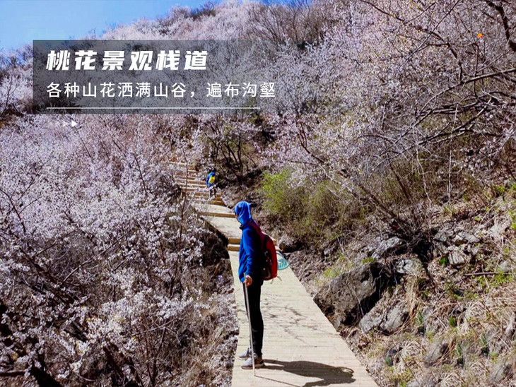 桃花栈道每逢三月底左右是野杏花、桃花盛开的季节,桃花林各种山花洒满山谷,遍布沟壑,一枝枝一串串,含英吐蕊,竞相开放,把黑的山谷映照得一片明媚的山花!