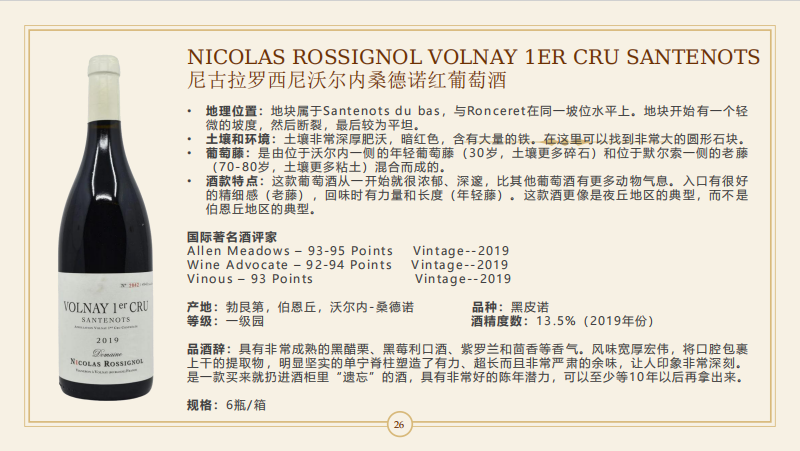 【高分优雅一级园佳酿】Nicolas Rossignol Volnay 1Er Cru Santenots 2017 750Ml 尼古拉罗西尼沃尔内桑德诺红葡萄酒