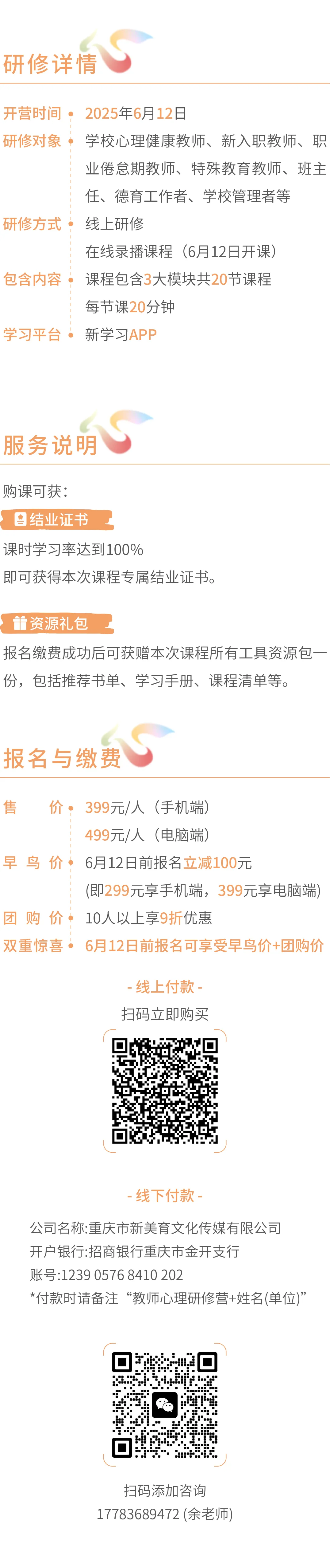 ▷破解情绪困局:“觉察情绪-接纳情绪-转化情绪”,帮助教师从情绪波动中抽离,掌握科学工具有效平复压力,摆脱职业倦怠。