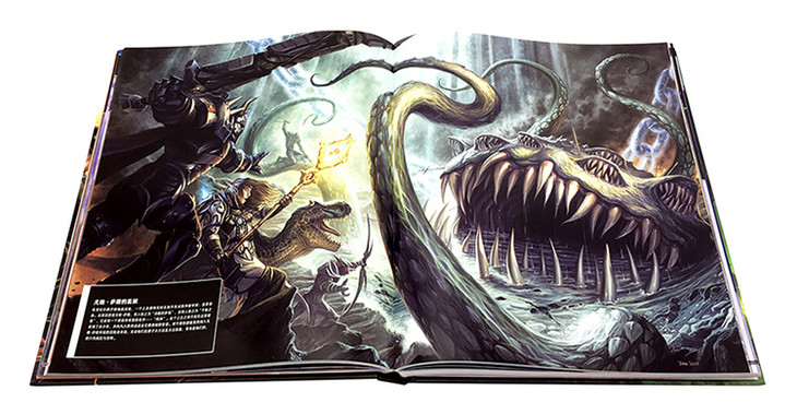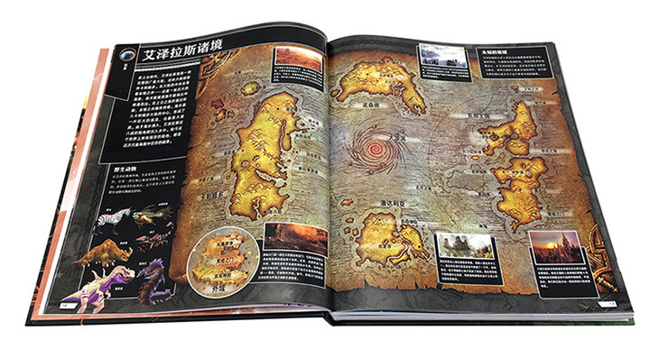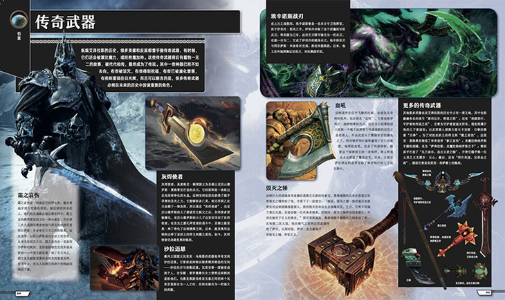 引言部分对艾泽拉斯世界进行综述介绍,内容涵盖地理、种族、外交、魔法与科技进展等要素,更辟出两页,专门介绍游戏中那些魅力无穷的传奇武器和它们背后的故事。