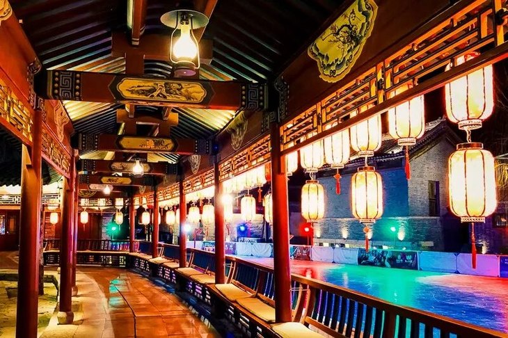 司马小烧酒坊→永顺染坊→剪纸店→皮影戏馆→日月岛广场→震远镖局→八旗会馆→鸳鸯游船码头(可顺着湖边往回走,也可乘船游览)→英华书院→年画坊→风筝文化坊→月老庙→喊泉→小吃广场→雁归游船码头。