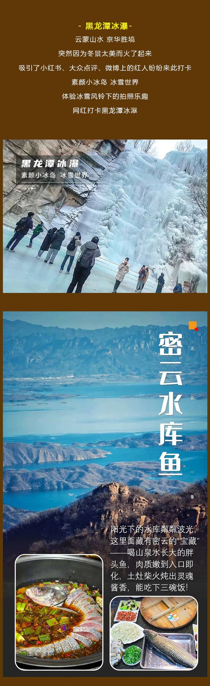 2)门票:套票团体220元(包含D2午餐密云水库鱼宴60元+古北水镇门票140元+黑龙潭景区门票60元),司马台长城门票40元自愿选择。