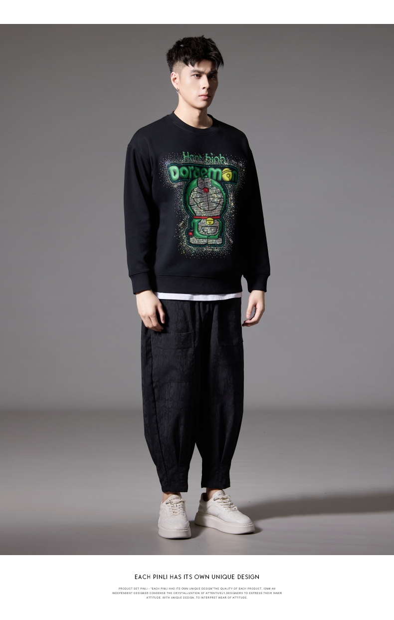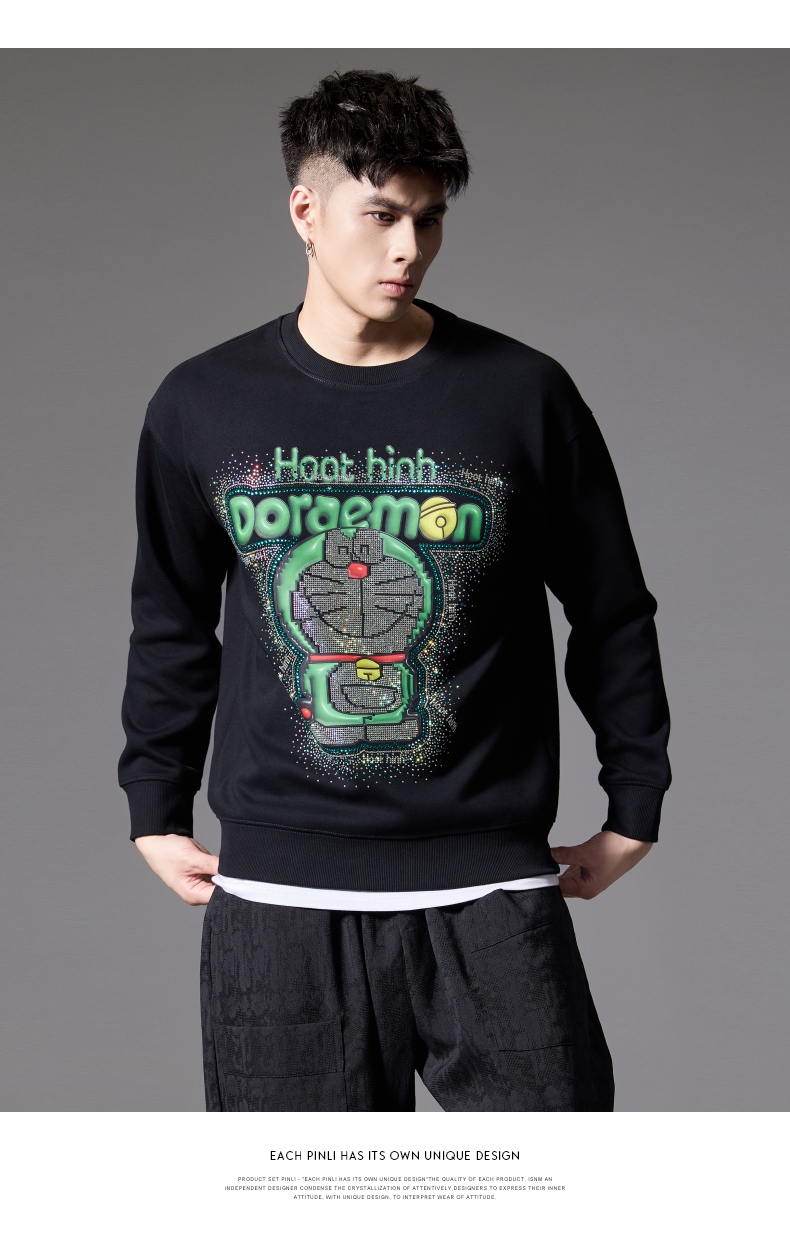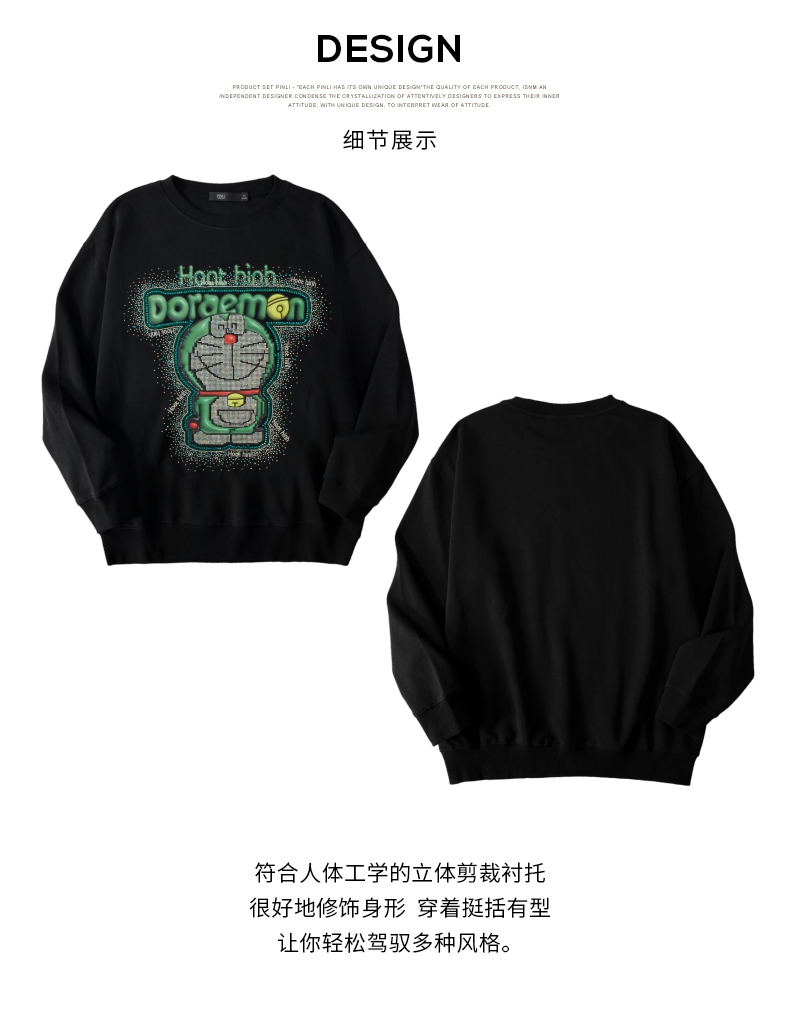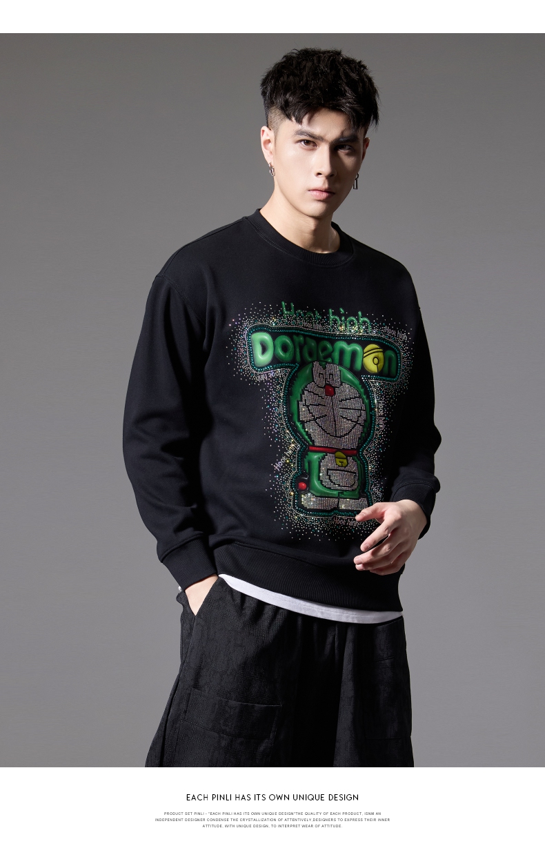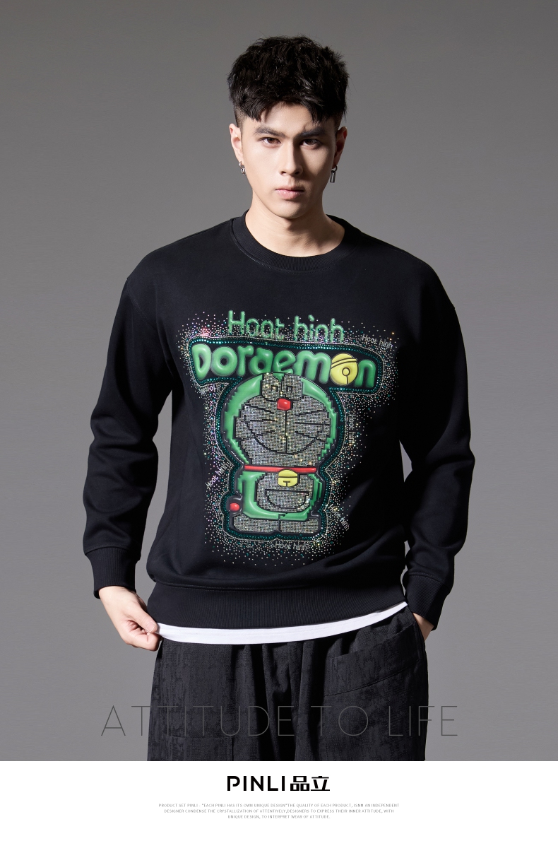 PINLI品立2024秋季新款男士烫钻叮当猫套头卫衣宽松潮牌休闲上衣BG243109012