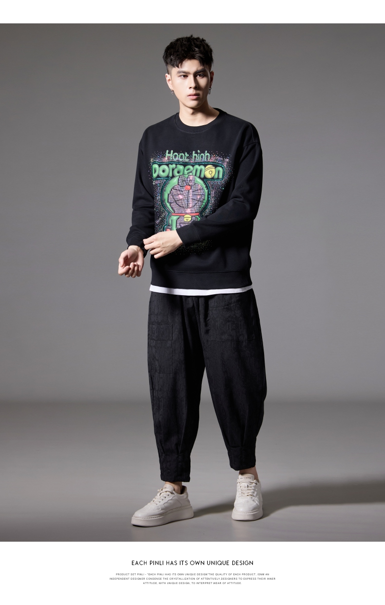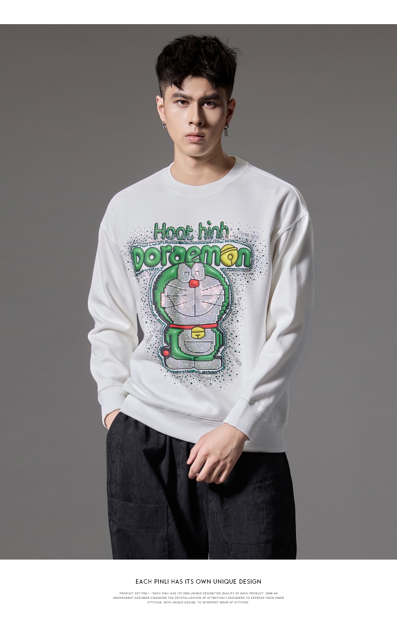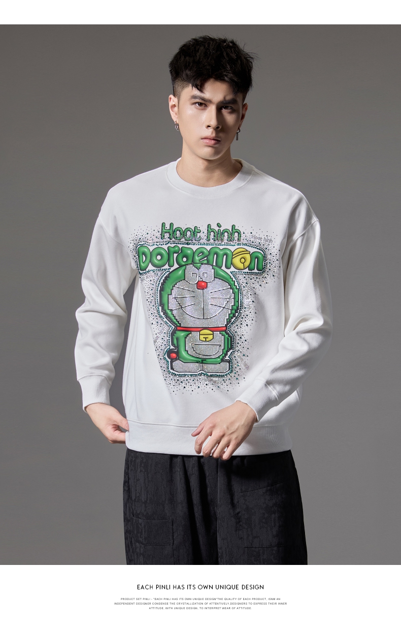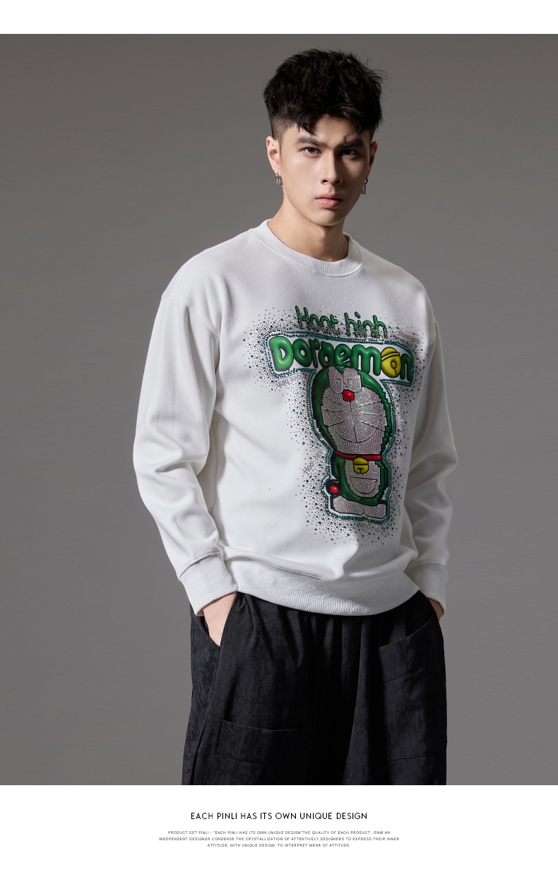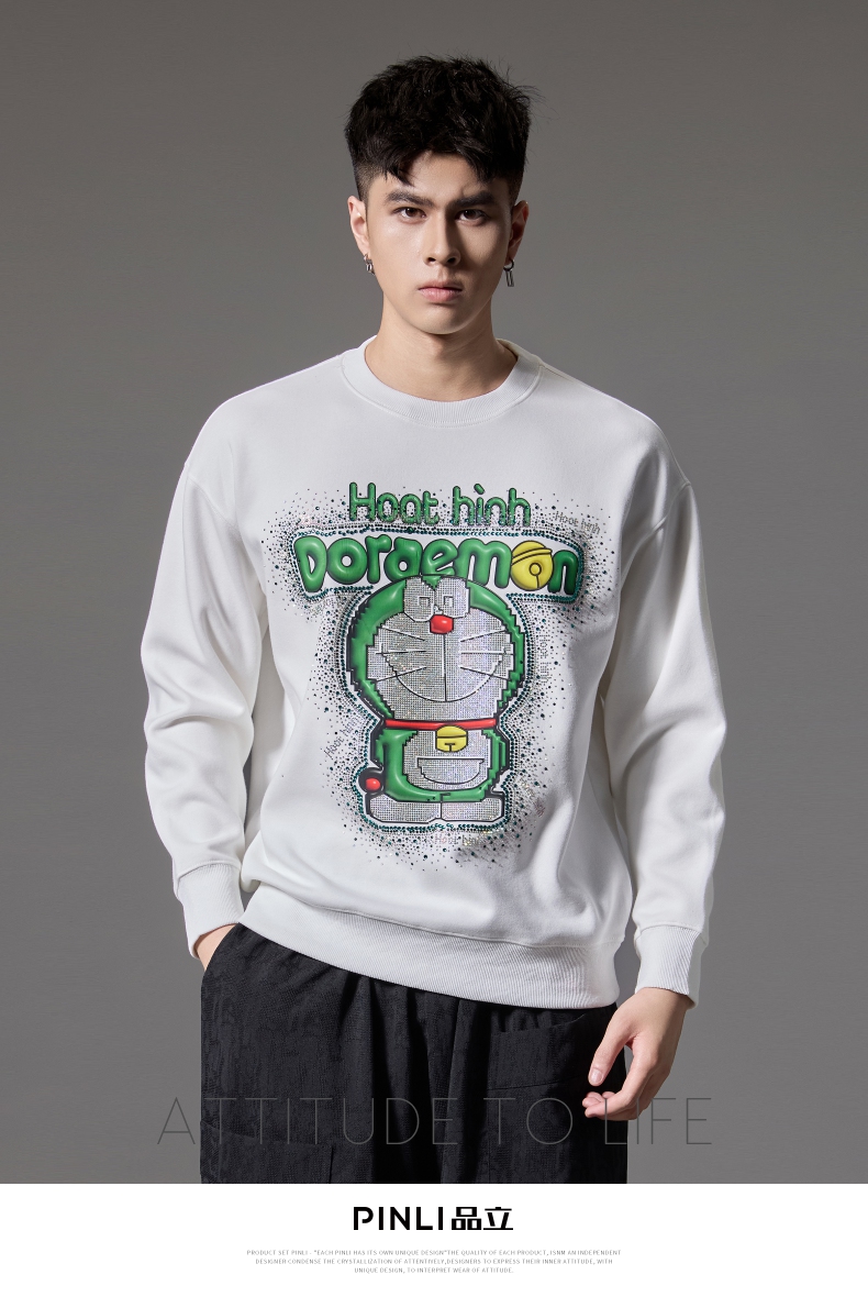 PINLI品立2024秋季新款男士烫钻叮当猫套头卫衣宽松潮牌休闲上衣BG243109012