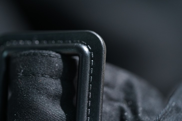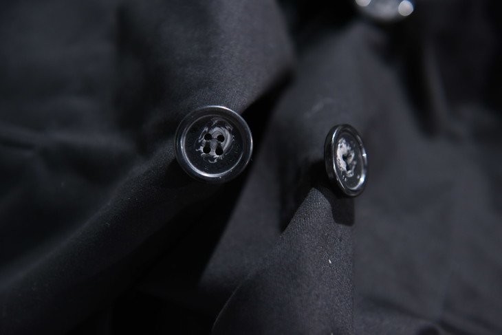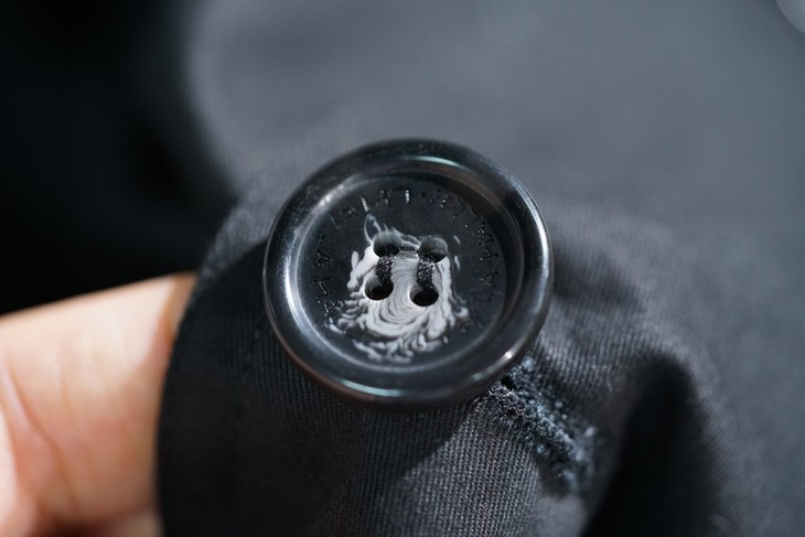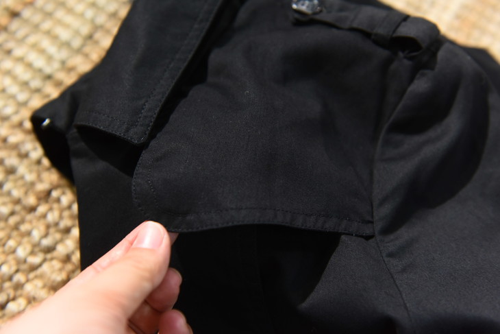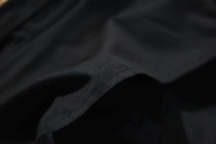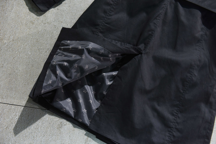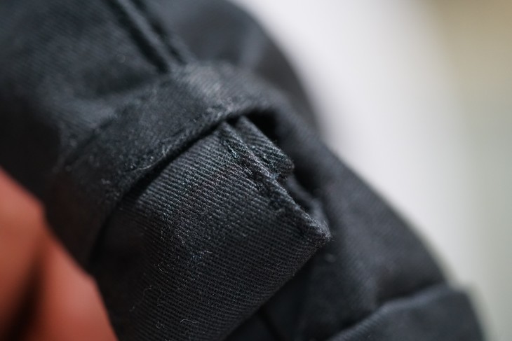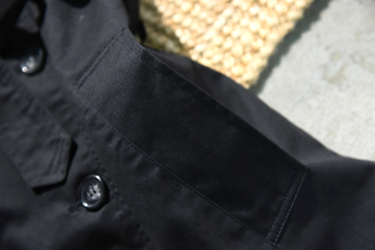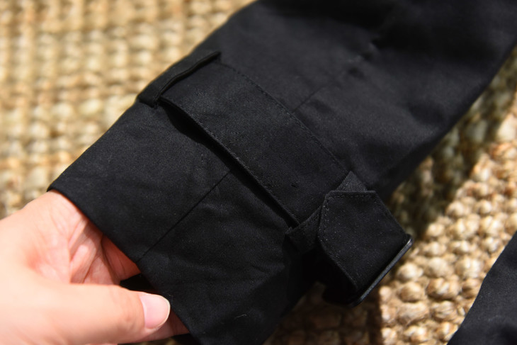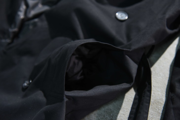 保留了对领口和袖口的紧固设计,袖子可以通过系带绑紧,领口更是设置了类似军装风纪扣的金属钩和藏在领子后面的系带进行紧固,这不光是为了防风挡雨的设计,