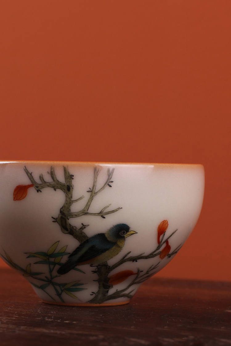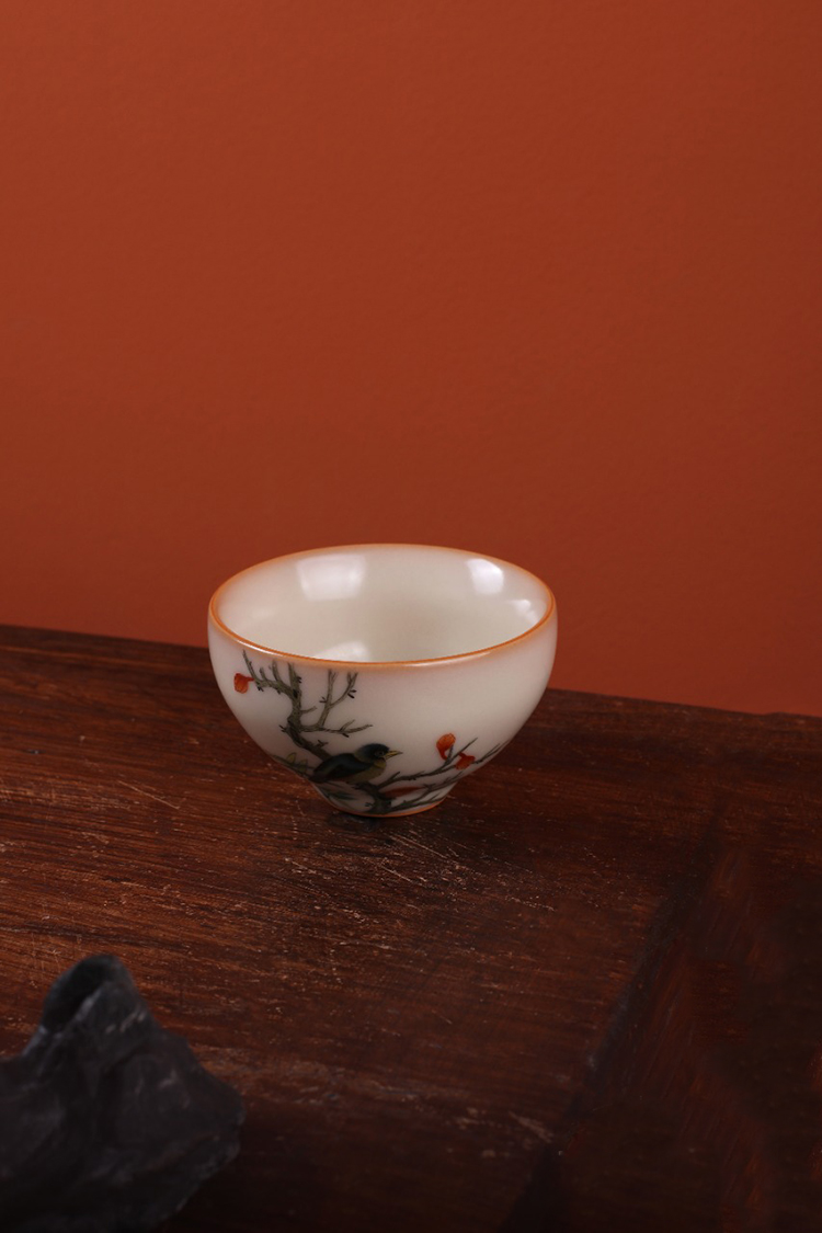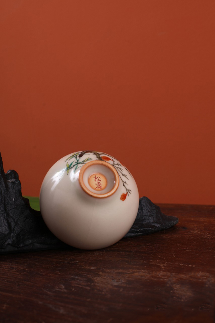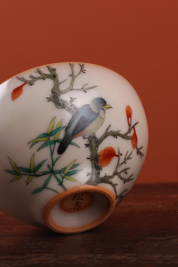 问鼎松涛彩绘哥窑玉盈杯(翠叶藏莺)(缺货)