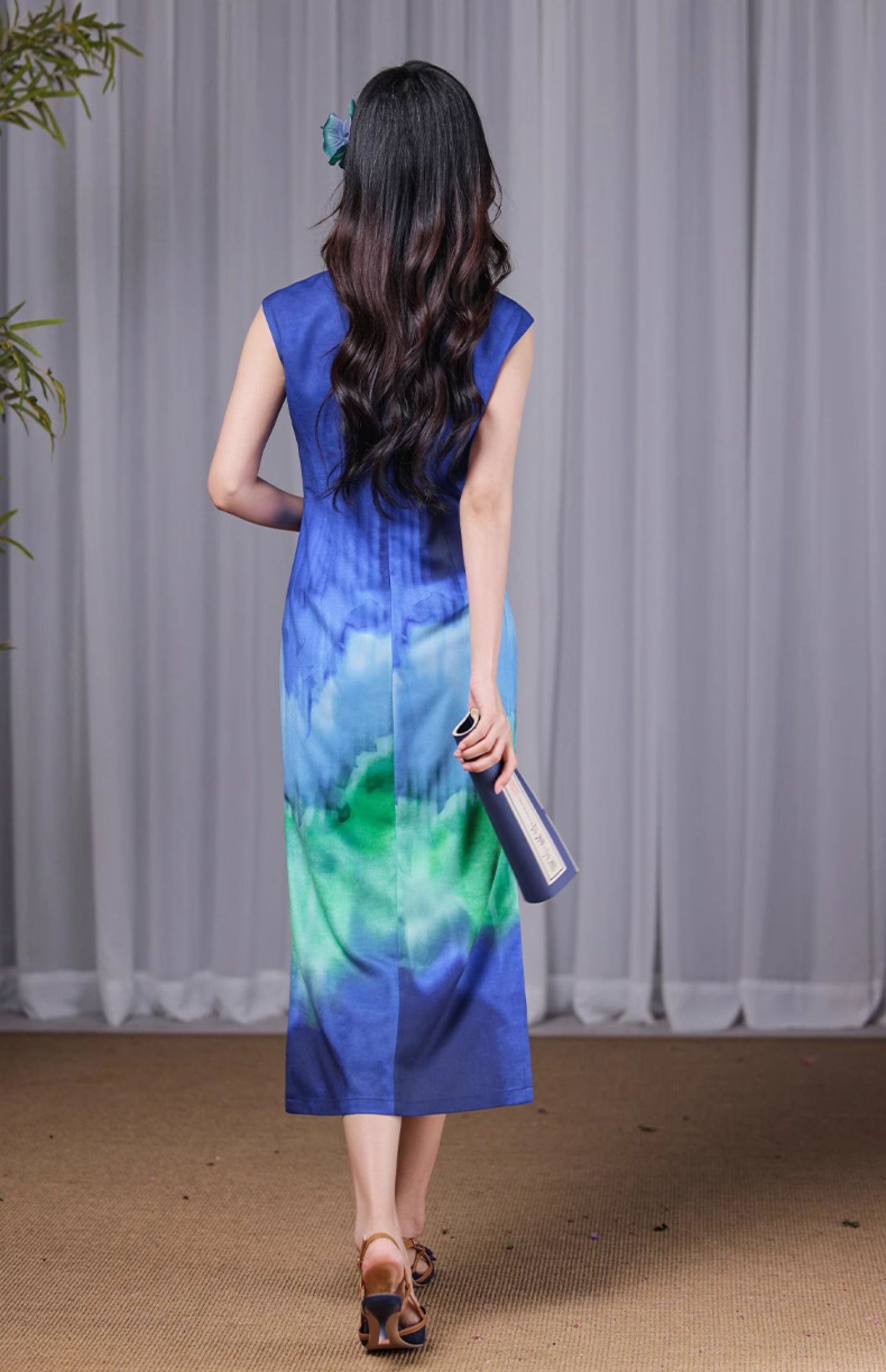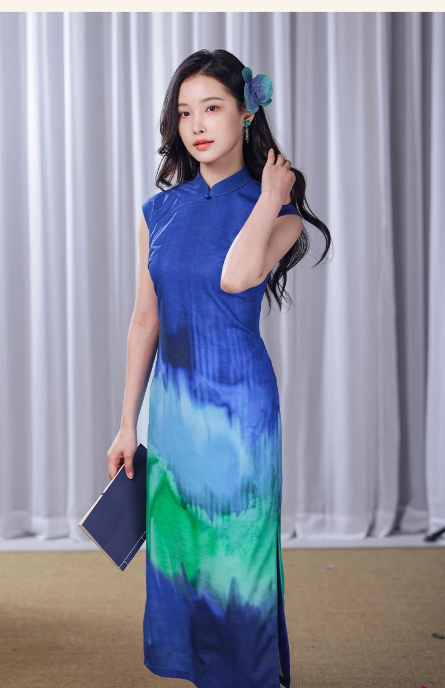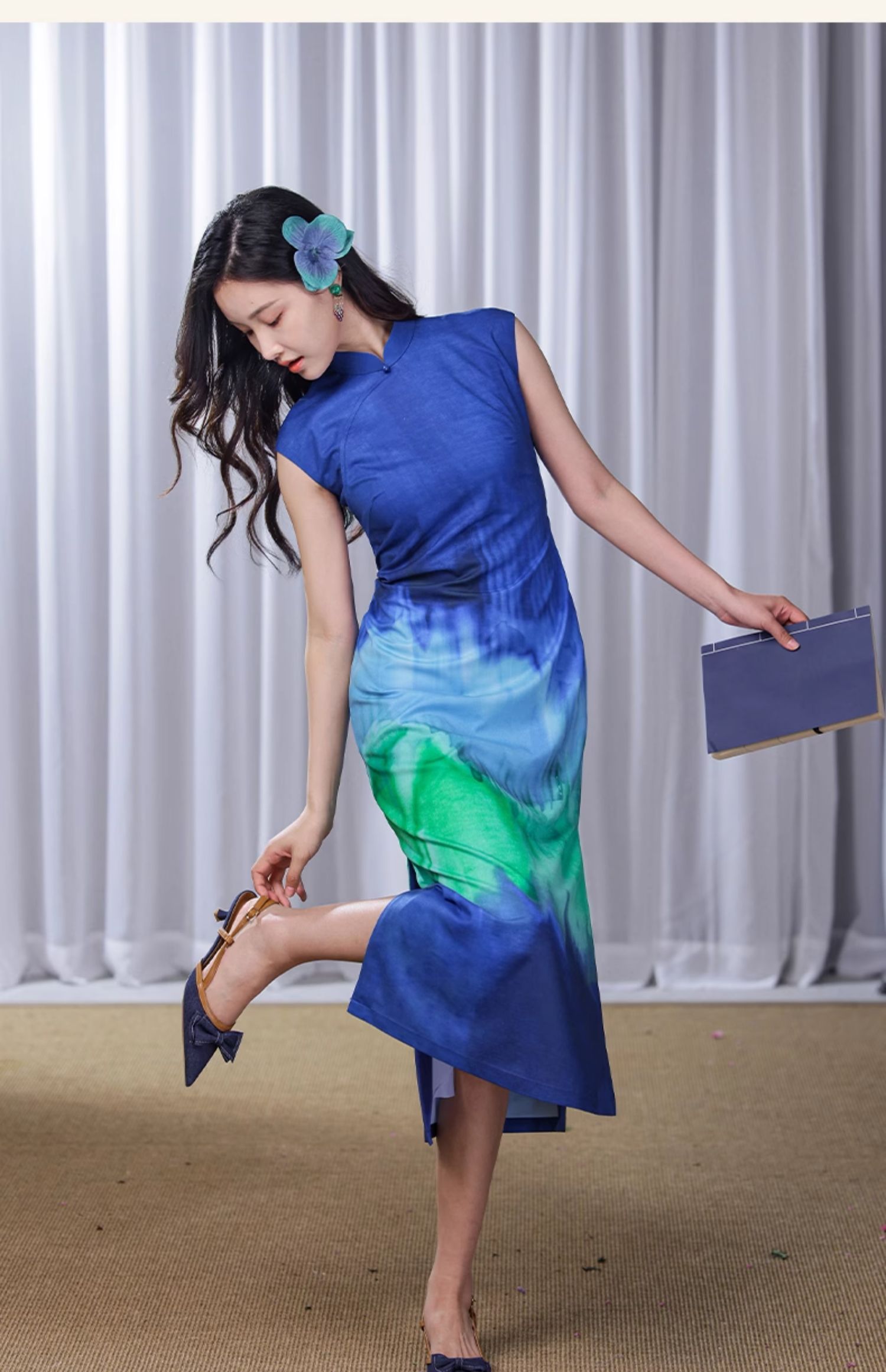 逸红颜玦光2025夏新款植物染青翠蓝靛艺术氛围感修身显瘦蓝旗袍女