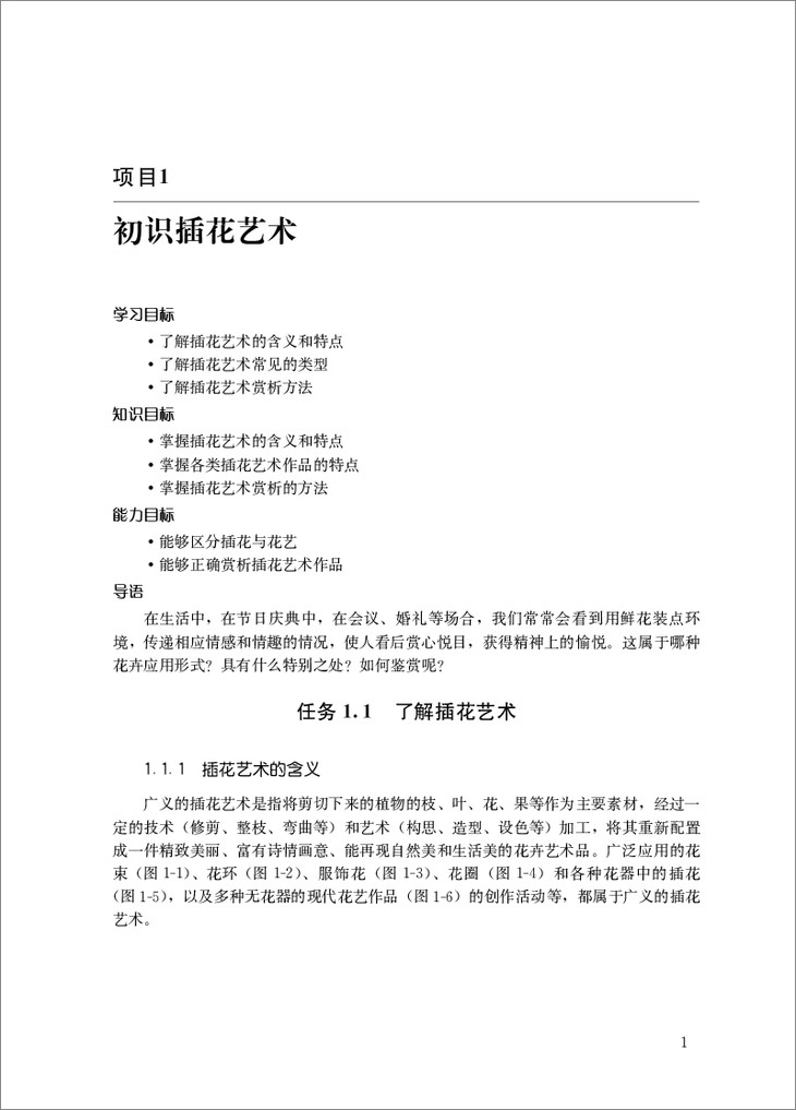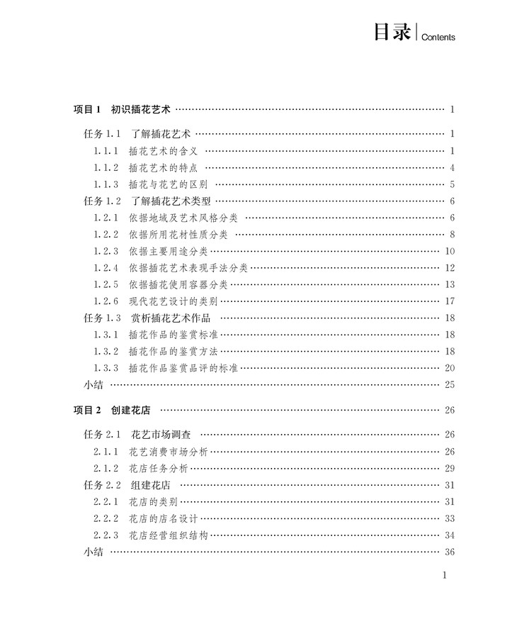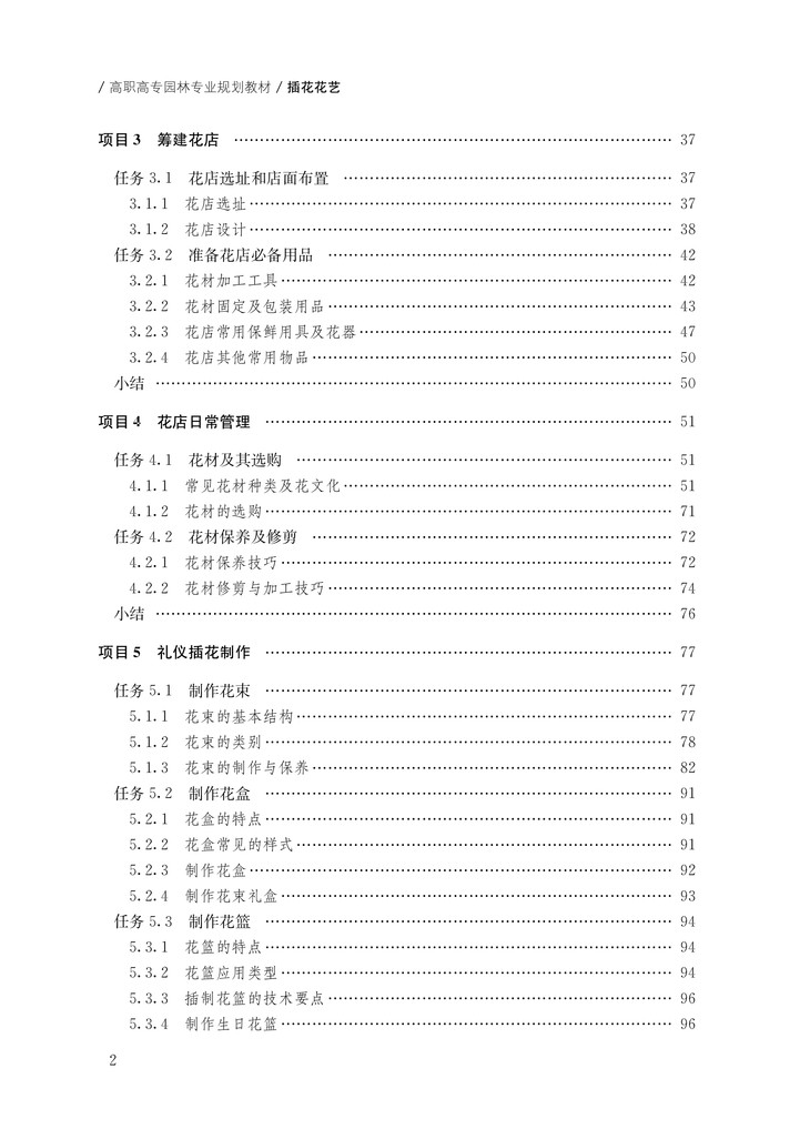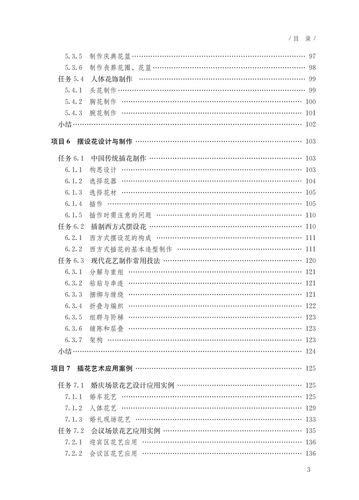 本教材由7个项目20个任务组成。项目一是初识插花艺术,项目二、项目三、项目四分别是花店创建、筹建与日常管理,项目五、项目六、项目七是插花花艺制作与应用。