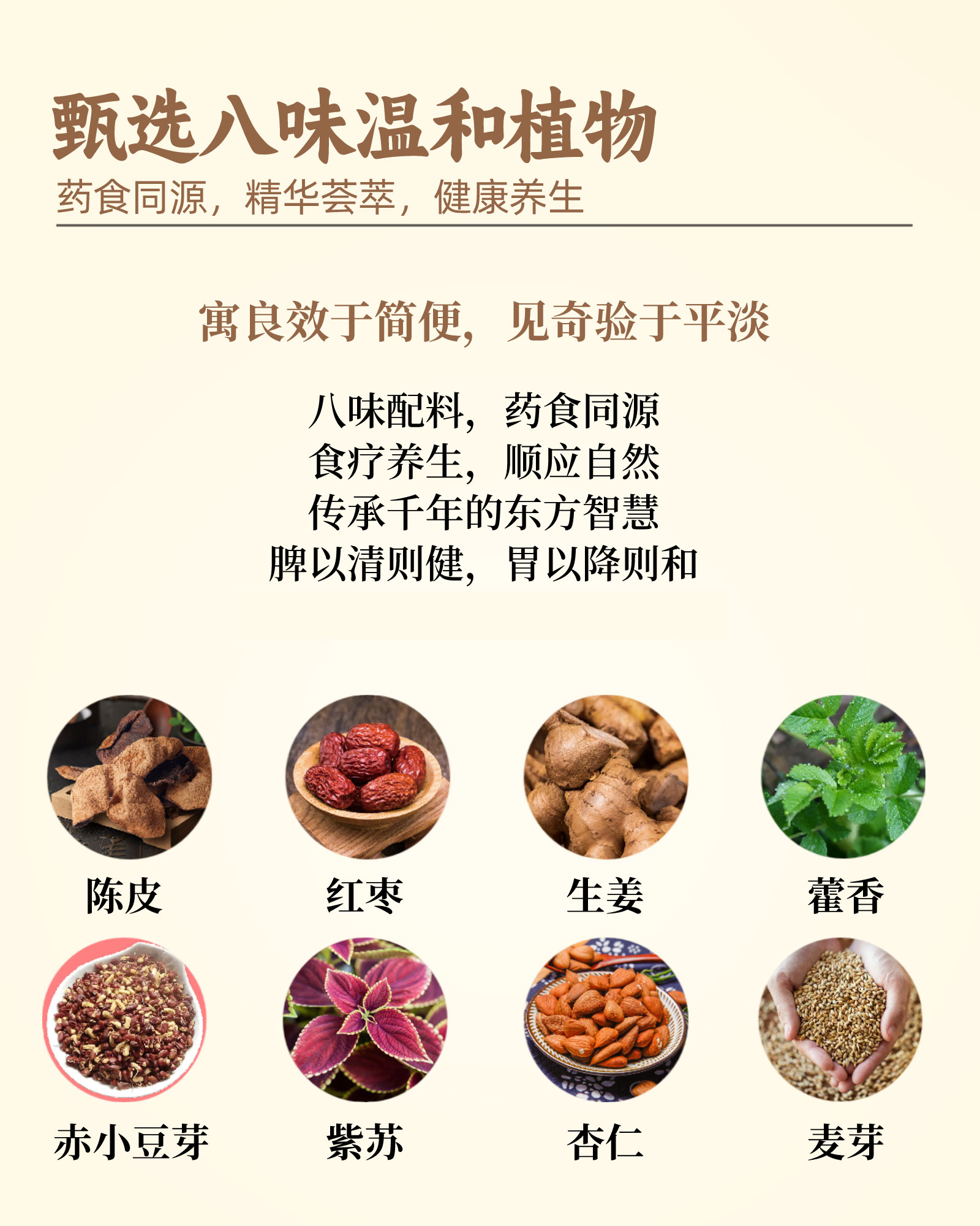 【配料】杏仁、陈皮、赤小豆(芽)、生姜、紫苏叶、藿香、麦芽、大枣、水