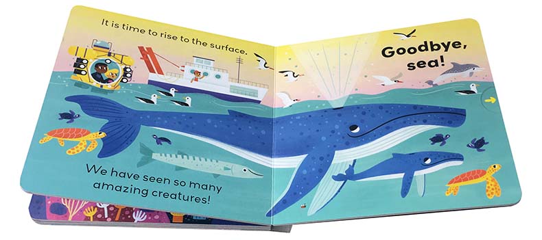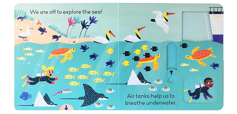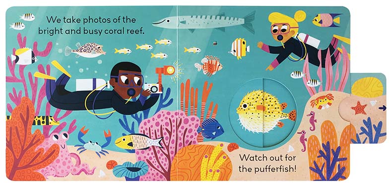 准备好来一趟海洋之旅了吗?背上潜水用的氧气筒,你也可以自由地在徜徉海底,与各种奇妙的生物一起玩乐。海龟、魟鱼、小丑鱼都在你的身边游泳,拉开拉页,还有长长的海鳗,你见过吗?仔细观察,享受探险的乐趣!