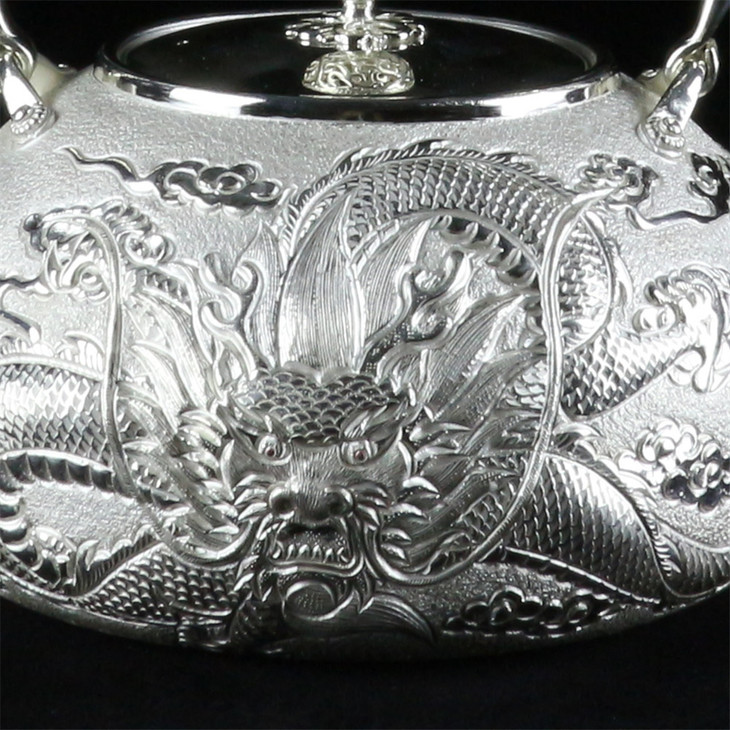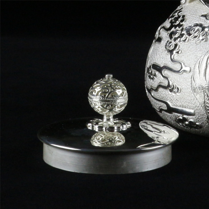 此壶造型传统,壶身作亚光感,捶牒出壶身两侧云龙纹呈光亮银色,制做难度很高,正面龙威猛大气。盖钮为镂空转心缠枝纹,拔动即转且有悦耳银铃声。此壶容量颇大,可供数友共烹香茶,谈古谈今间思绪已在九霄之外。