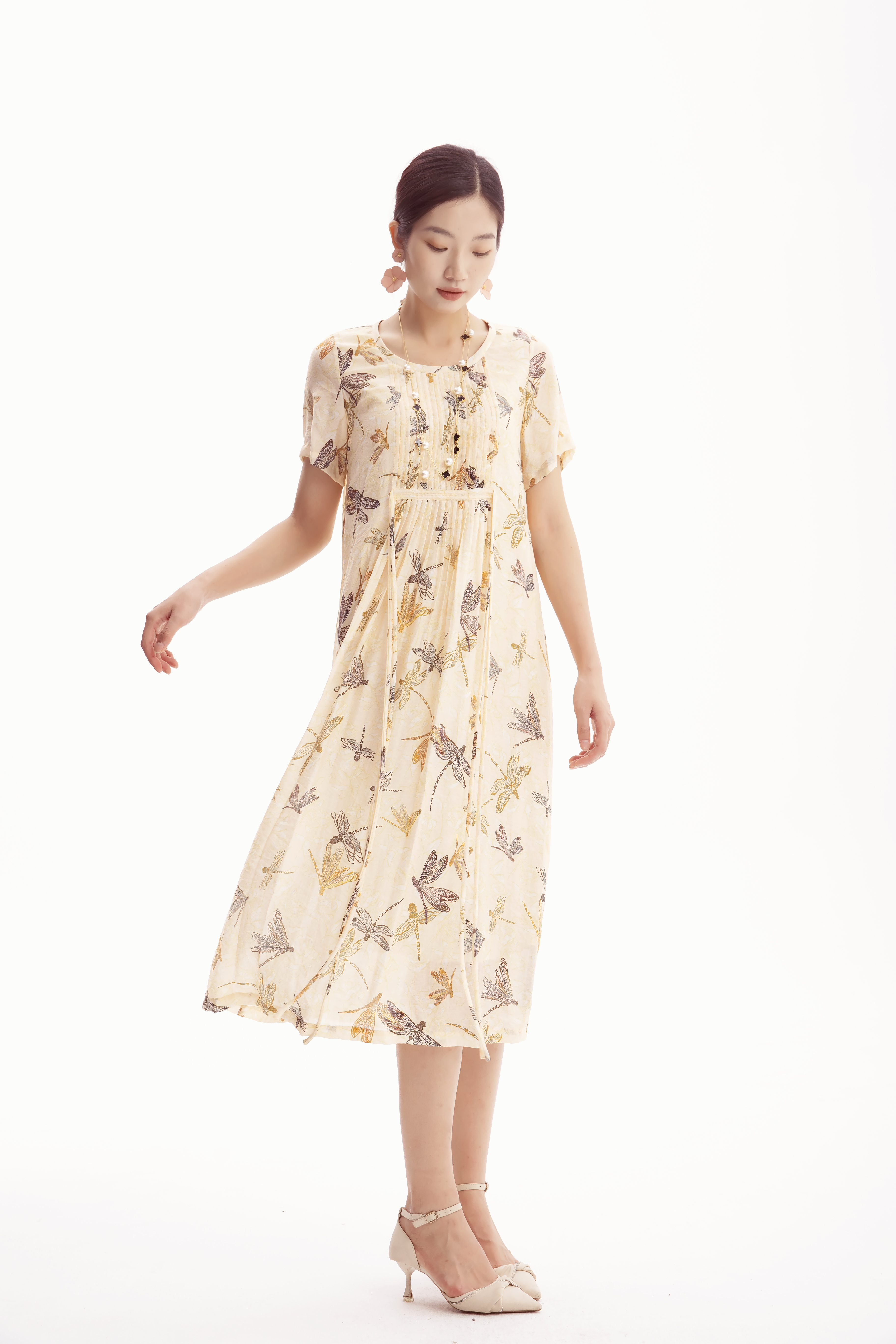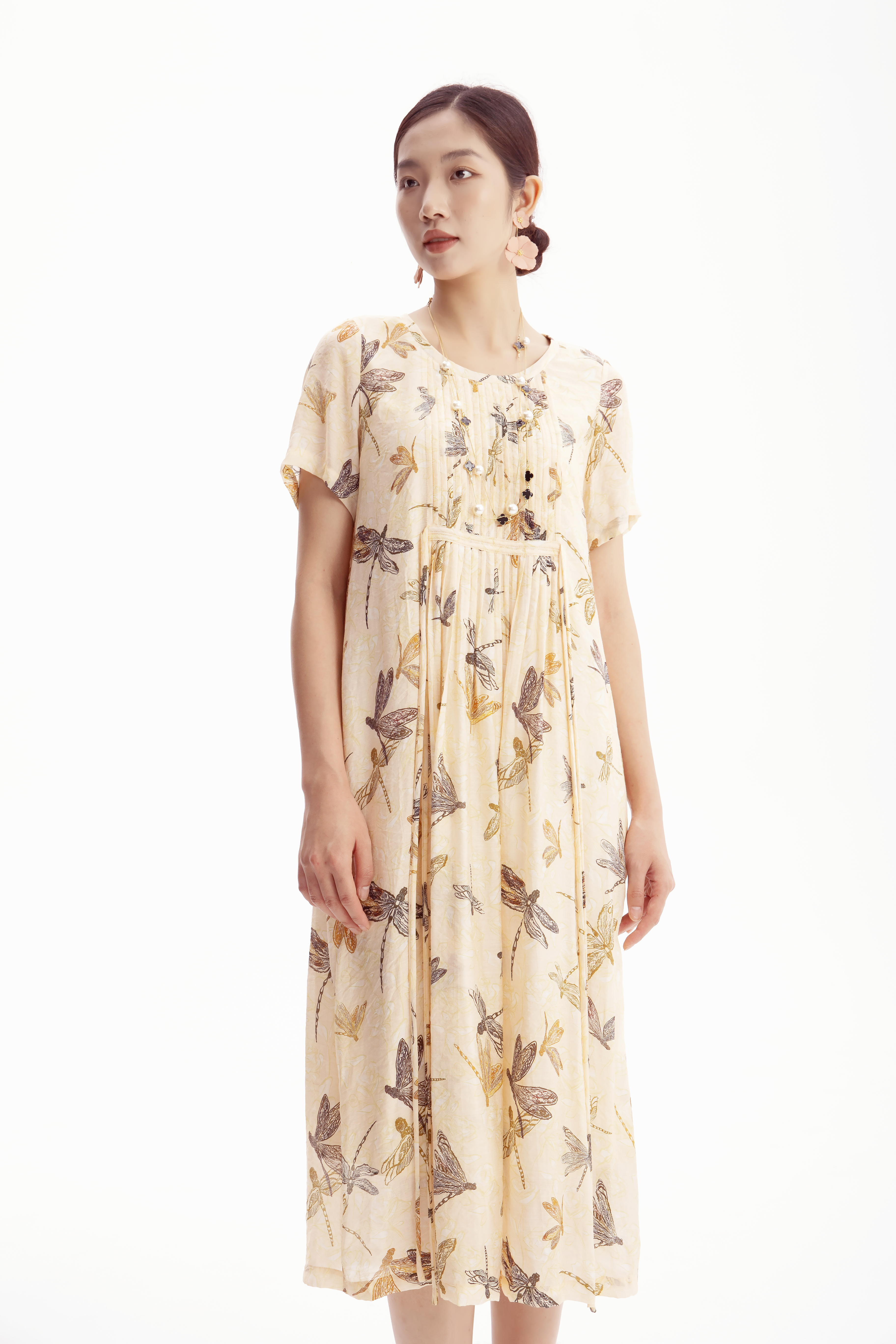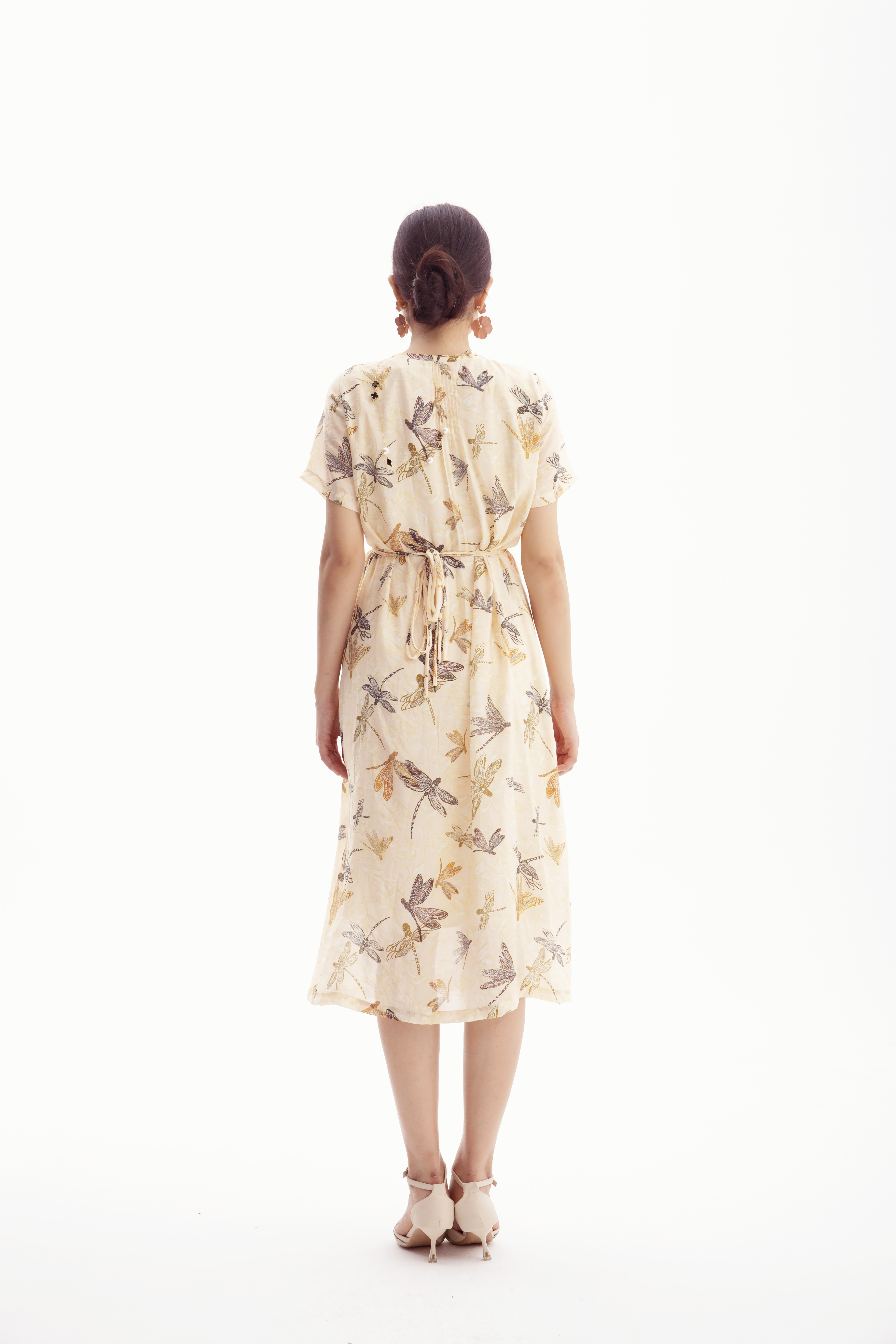 HJ2S57_如梦令色_连衣裙_夏季_优雅复古蜻蜓印花圆领收褶宽松 A 字长裙_高级女装_BERNIEELEN 伯妮斯茵