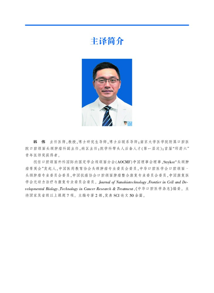 韩伟,主任医师,教授,博士研究生导师,博士后联系导师;南京大学医学院附属口腔医院口腔颌面头颈肿瘤科副主任,病区主任;院学科带头人后备人才(第一层次);首届“邱蔚六”青年医师奖获得者。担任口腔颌面外科国际内固定学会颅颌面分会(AOCMF)中国理事会理事,Stryker“头颈肿瘤菁英会”发起人,中国医药教育协会头颈肿瘤专业委员会委员,中华口腔医学会口腔颌面–头颈肿瘤专业委员会委员,中国抗癌协会口腔颌面肿瘤整合康复专业委员会委员,中国康复医学会光动力治疗与康复专业委员会委员。Journal of Nanobiotechnology 、 Frontier in Cell and Developmental Biology 、Technology in Cancer Research & Treatment、《中华口腔医学杂志》编委。主持国家及省级以上课题7项。主编专著2部,发表SCI论文50余篇。