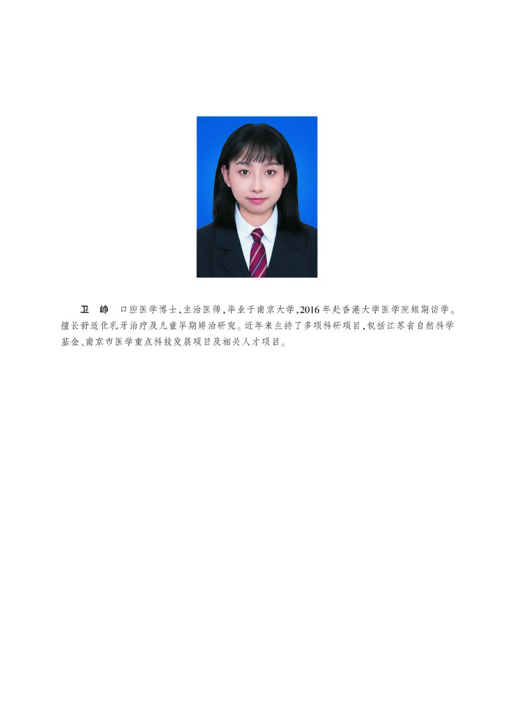 卫峥,口腔医学博士,主治医师,毕业于南京大学,2016年赴香港大学医学院短期访学。擅长舒适化乳牙治疗及儿童早期矫治研究。近年来主持了多项科研项目,包括江苏省自然科学基金、南京市医学重点科技发展项目及相关人才项目。
