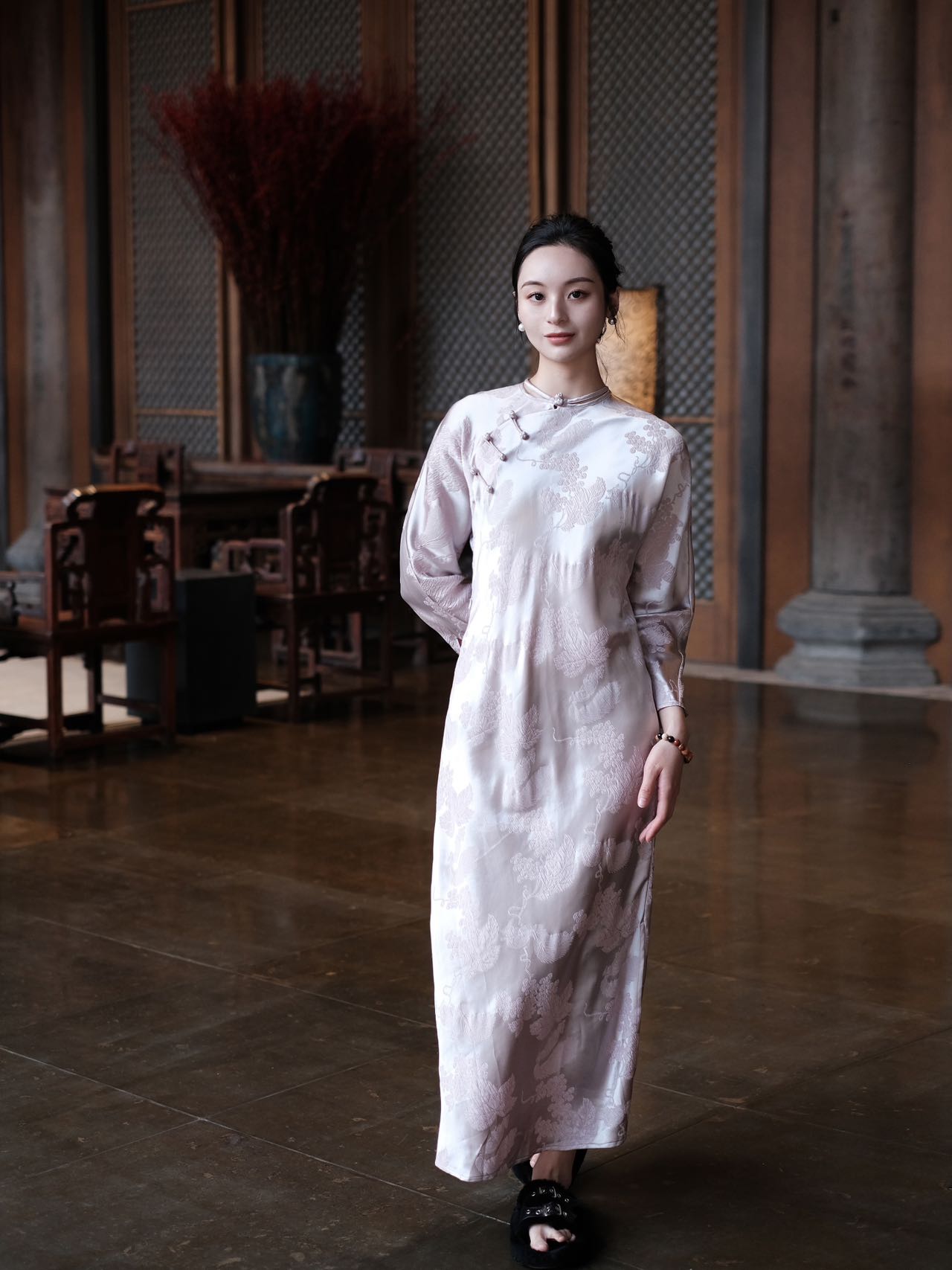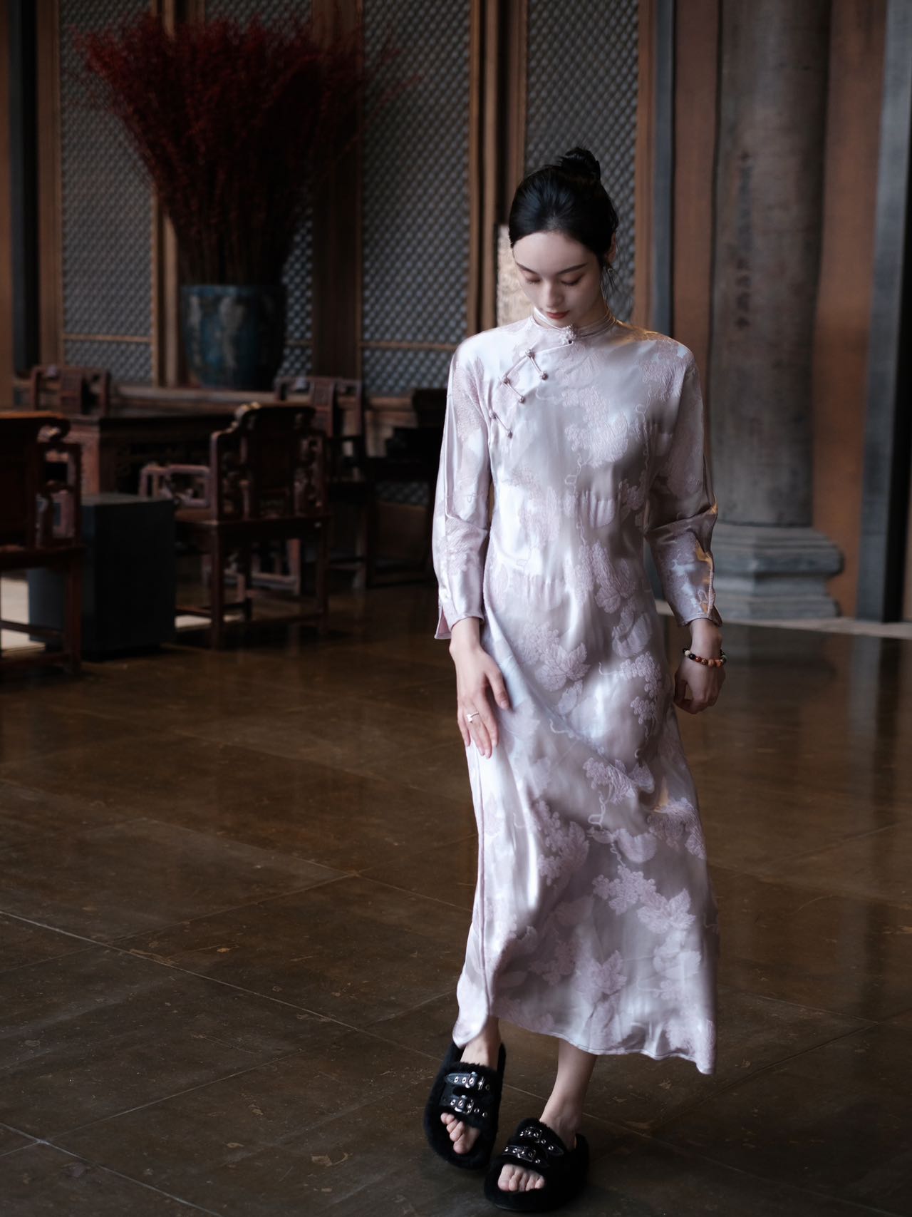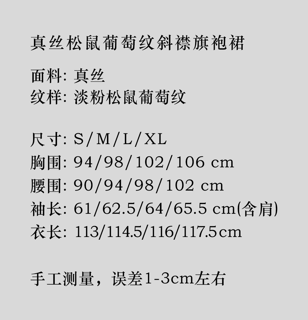 盛唐牡丹 |淡粉松鼠葡萄真丝斜襟旗袍裙