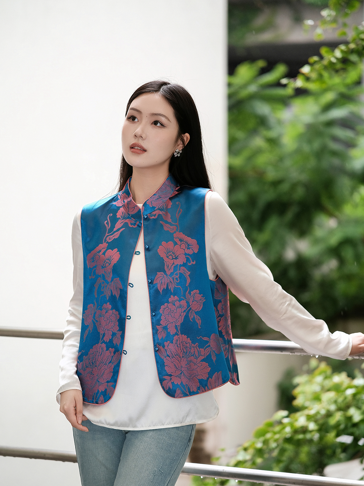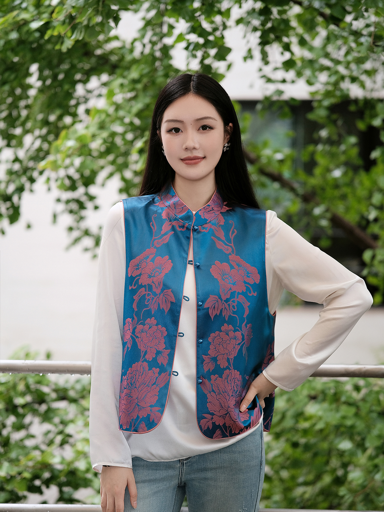 盛唐婧 | 轻奢新中式老缎提花对花对襟马甲-蓝色
