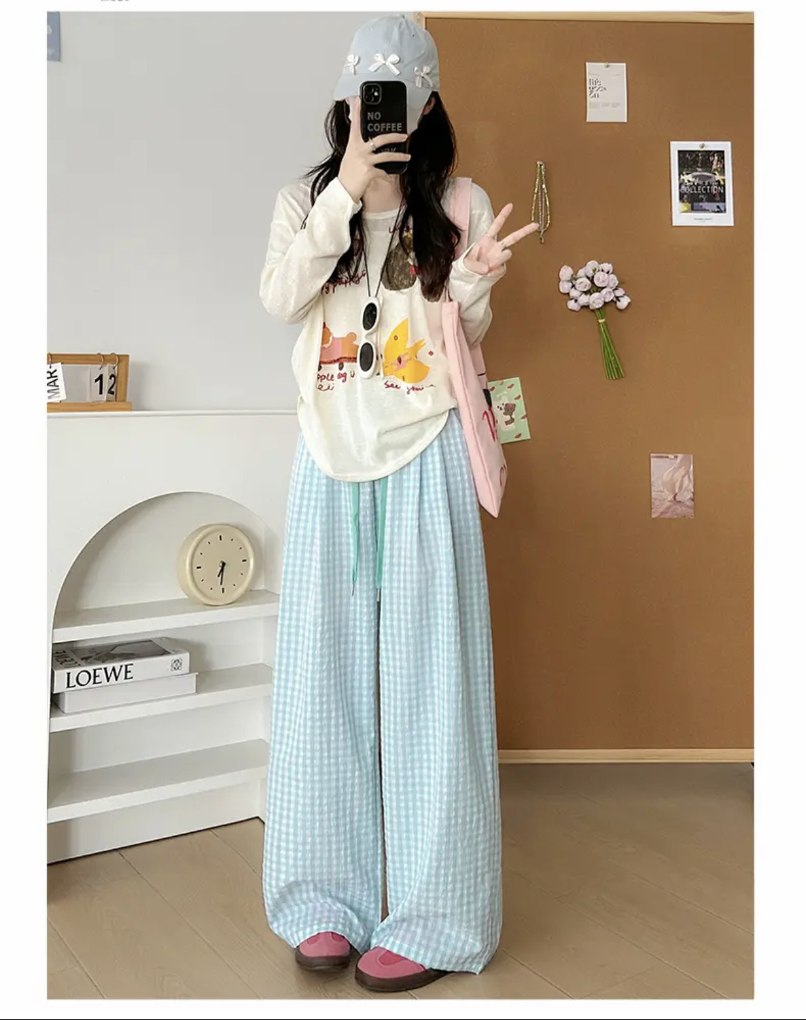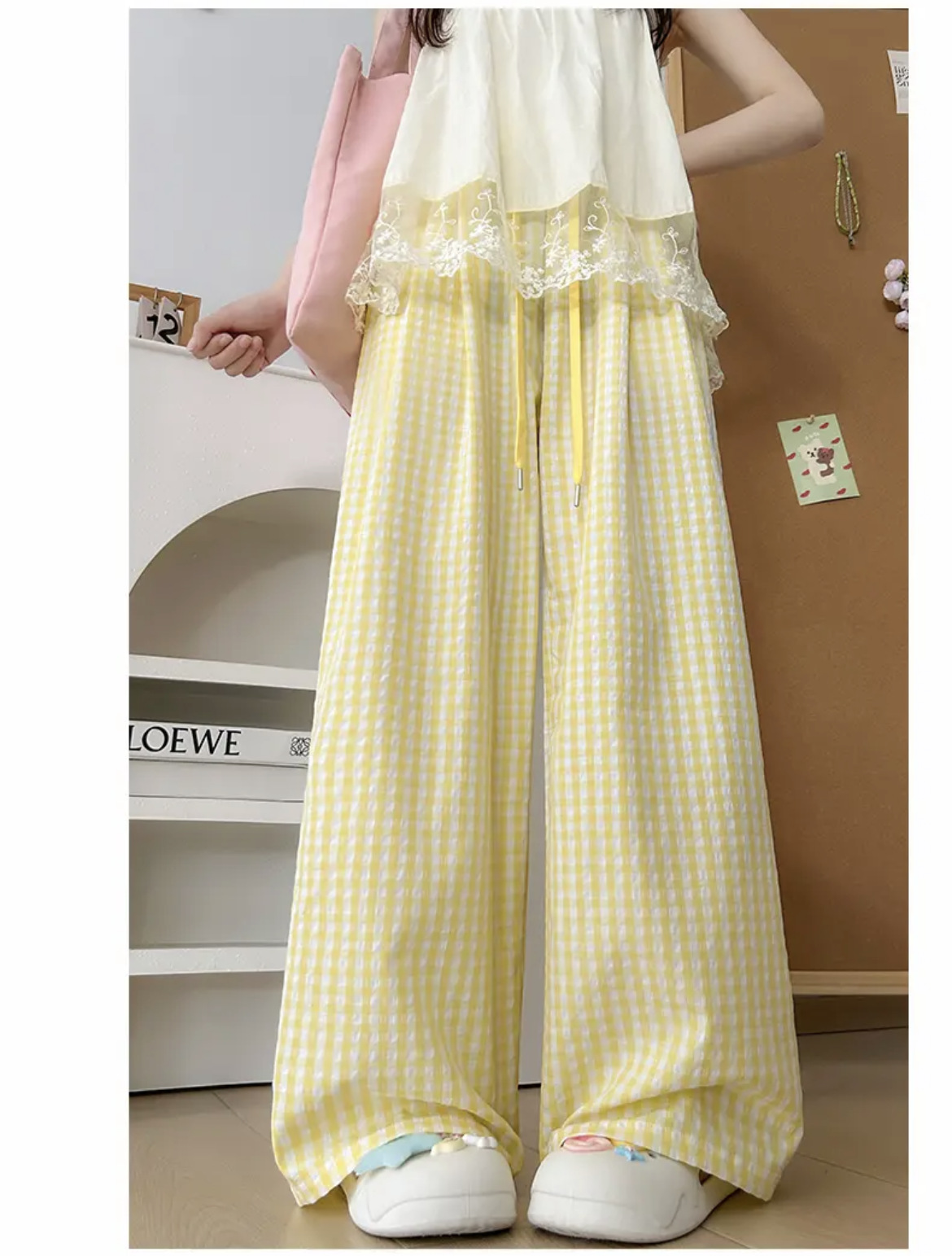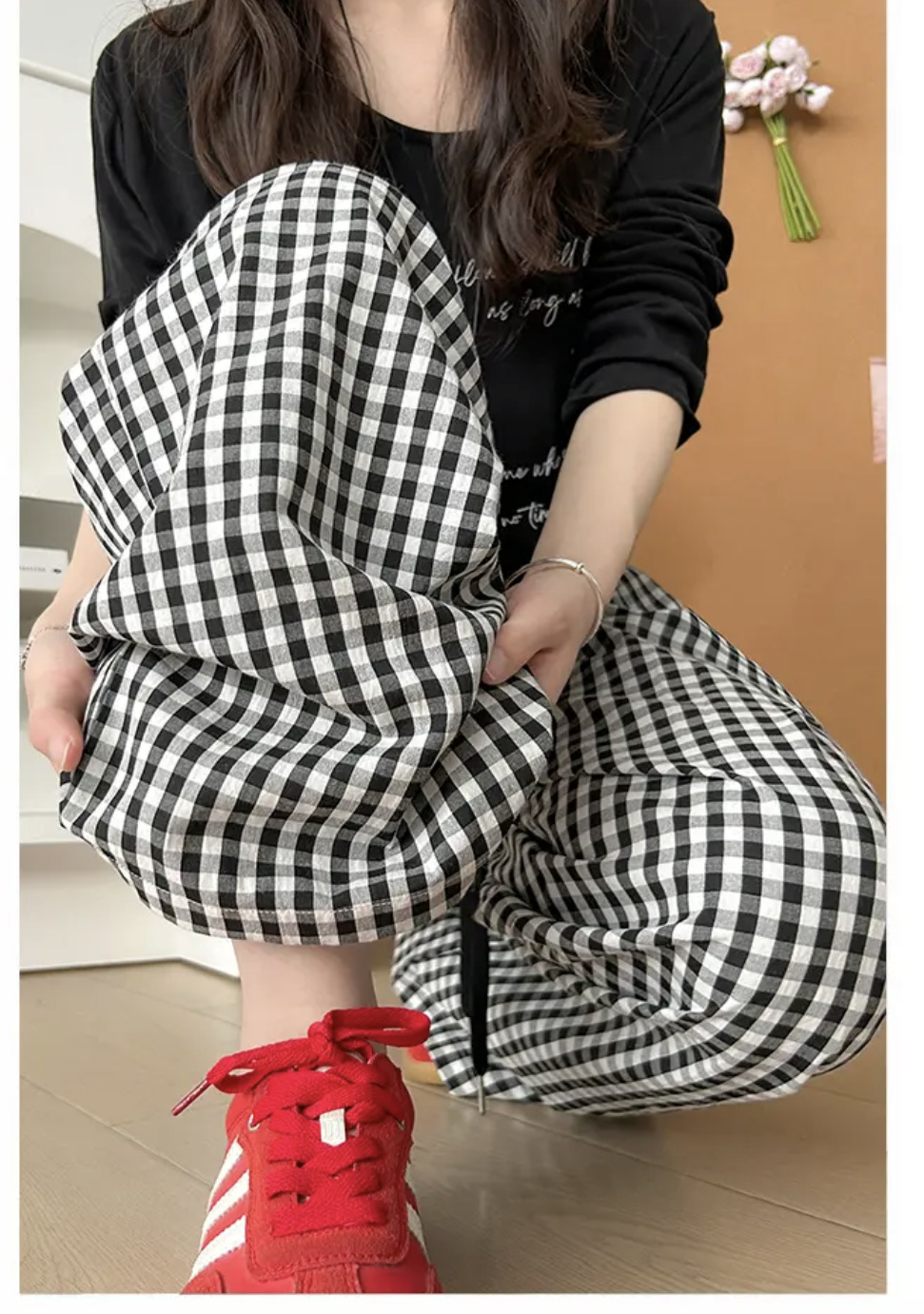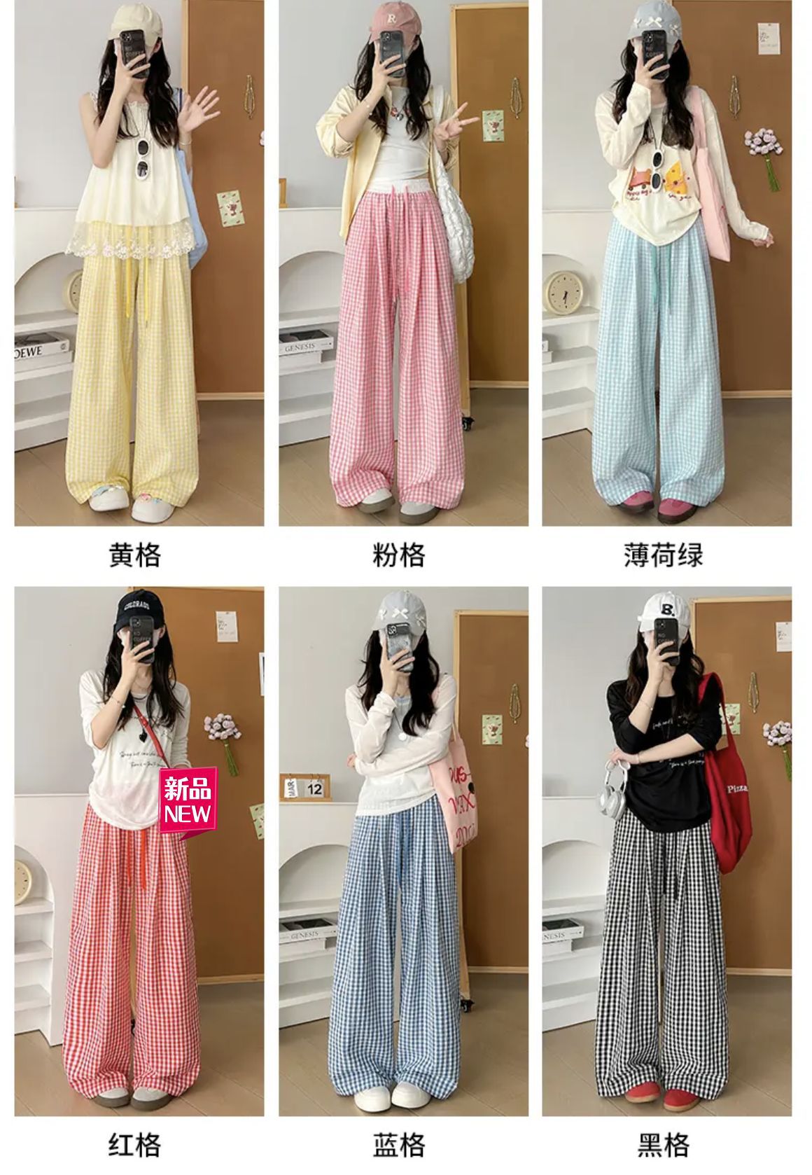 【清新元气❗️格子直筒裤】高弹宽松遮肉,抽绳松紧腰,通勤居家都能穿,百搭各种上衣,夏日出门超轻松,休闲宽松格纹女裤,多巴胺格子裤薄款高腰小个子阔腿裤L