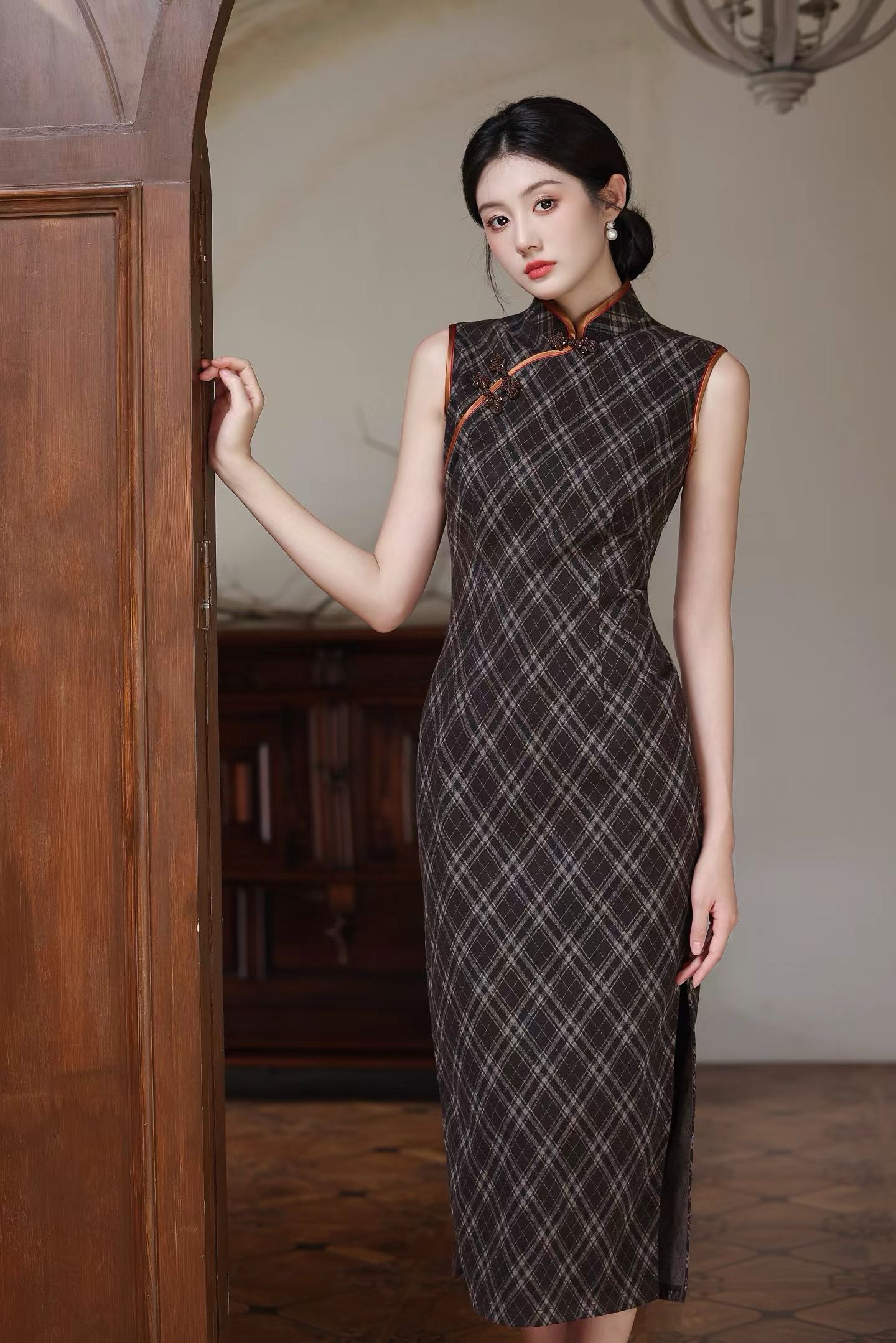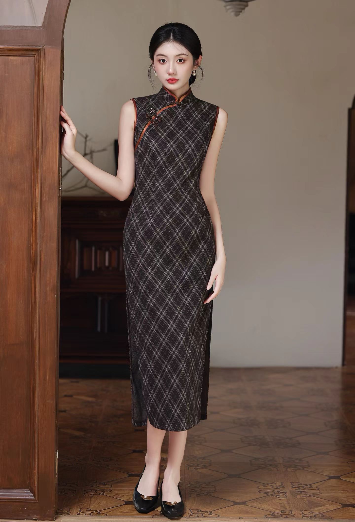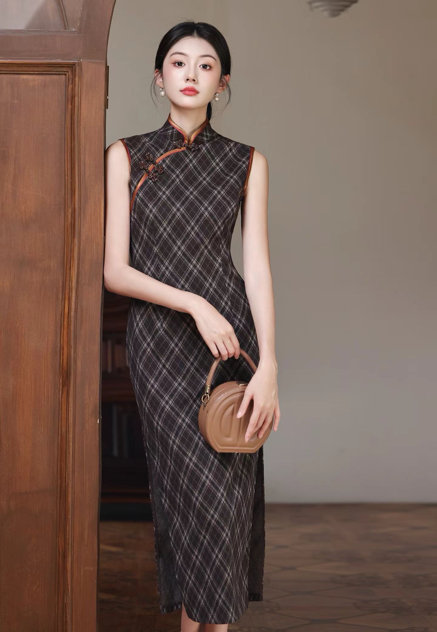 SZ3S88 咖色旗袍-【诗说先秦~与时尚对话,与年龄和解,与诗意重逢!】 云想衣裳花想容,春风拂槛露华浓。旗袍的立领,勾勒出脖颈的修长优雅,修身的剪裁,贴合身体曲线,菱格纹纵横交错,带着明清的雅意。