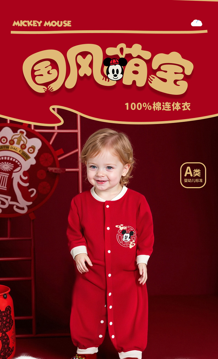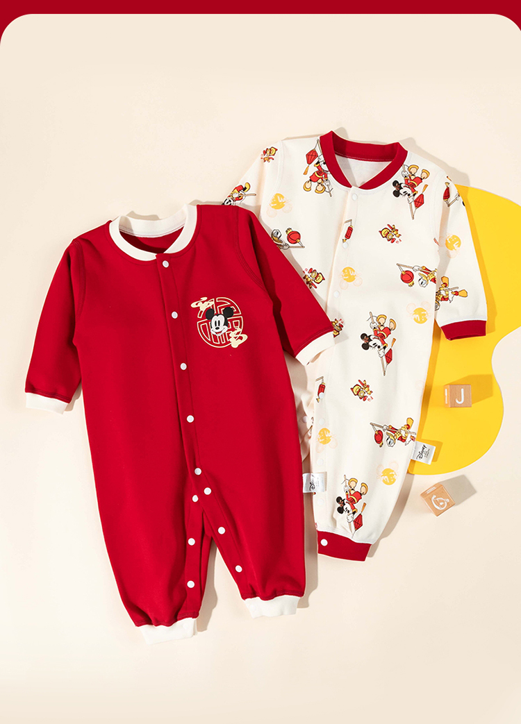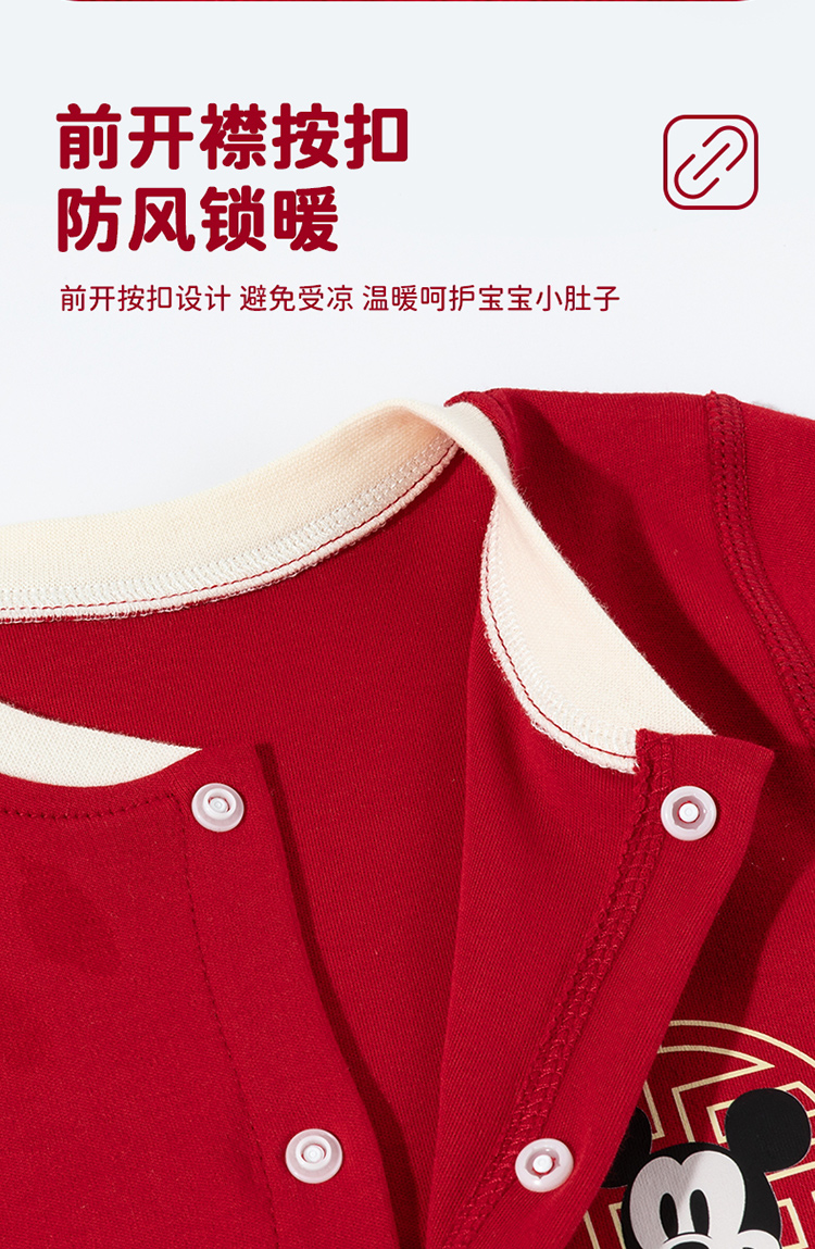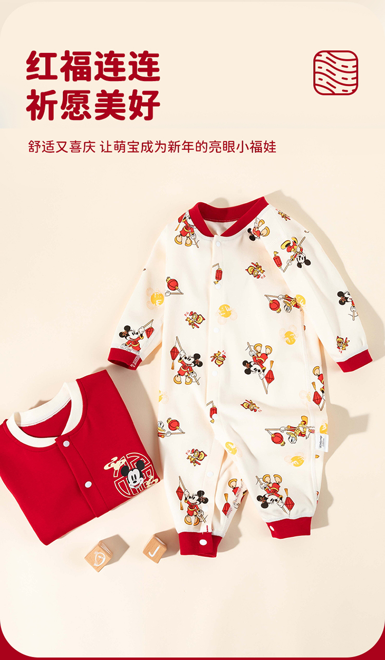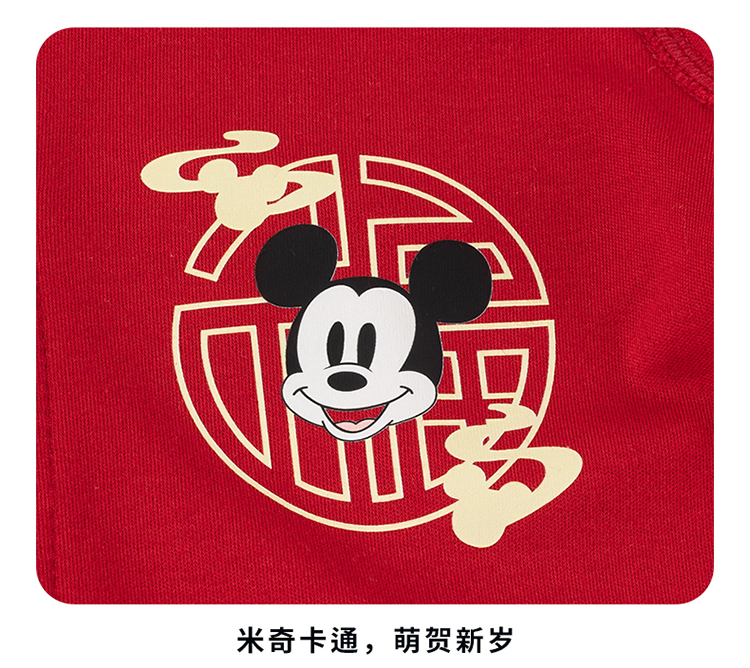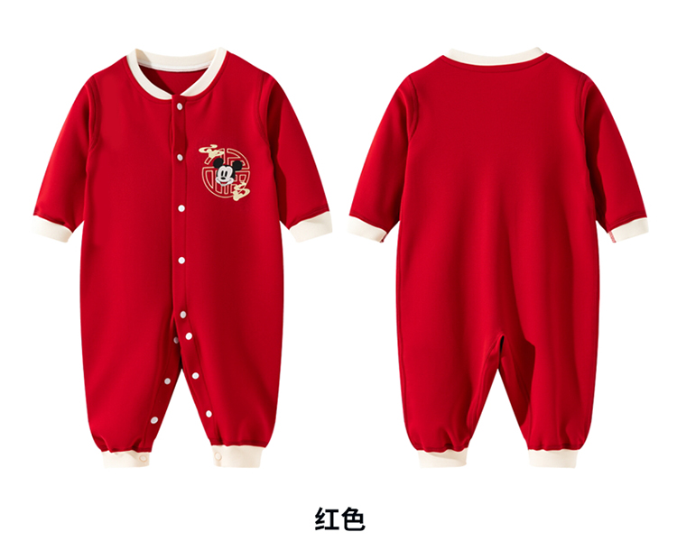 迪士尼【福气米奇】春秋新款男童连体衣男宝满月大红喜庆国风哈衣爬爬服ZD3EL026