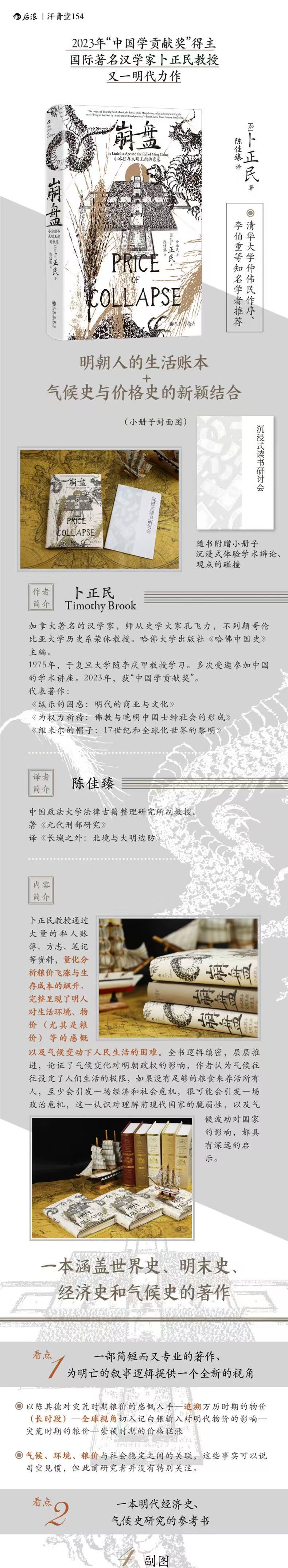 《崩盘:小冰期与大明王朝的衰落》是一部探讨明清鼎革和“十七世纪危机”的新著。本书基于对明代气候史、物价史资料的量化处理,重建了明代气候变动、价格演进的基本过程,阐明了小冰期是明朝覆亡的主因,书中对明代价格史数据的分类处理和对价格史与气候史之间关系的思考颇具建设性。本书还发挥了作者擅长讲故事的专长,以明末一位江南下层读书人的灾荒纪事为主要线索,讲述了气候变动给明人生活境况带来的巨大冲击,是一部学术性与可读性兼具的力作。