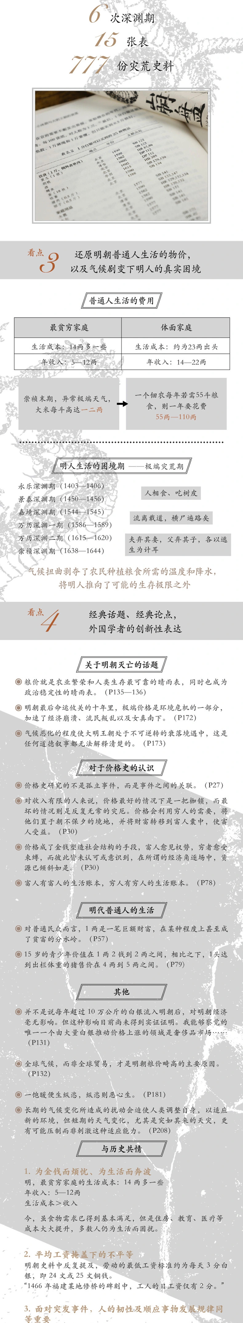 与生存成本的飙升,完整呈现了明人对生活环境、物价(尤其是粮价)等的感慨以及气候变动下人民生活的困难。全书逻辑缜密,层层推进,论证了气候变化对明朝政权的影响,作者认为气候往往设定了人们生活的极限,如果没有足够的粮食来养活所有人,至少会引发一场经济和社会危机,很可能会引发一场政治危机,这一认识对理解前现代国家的脆弱性,以及气候波动对国家的影响,都具有深远的启示。