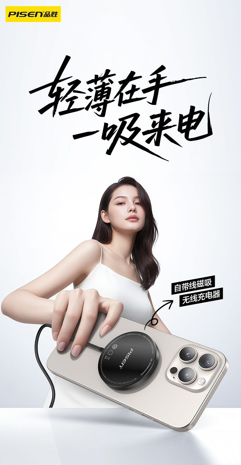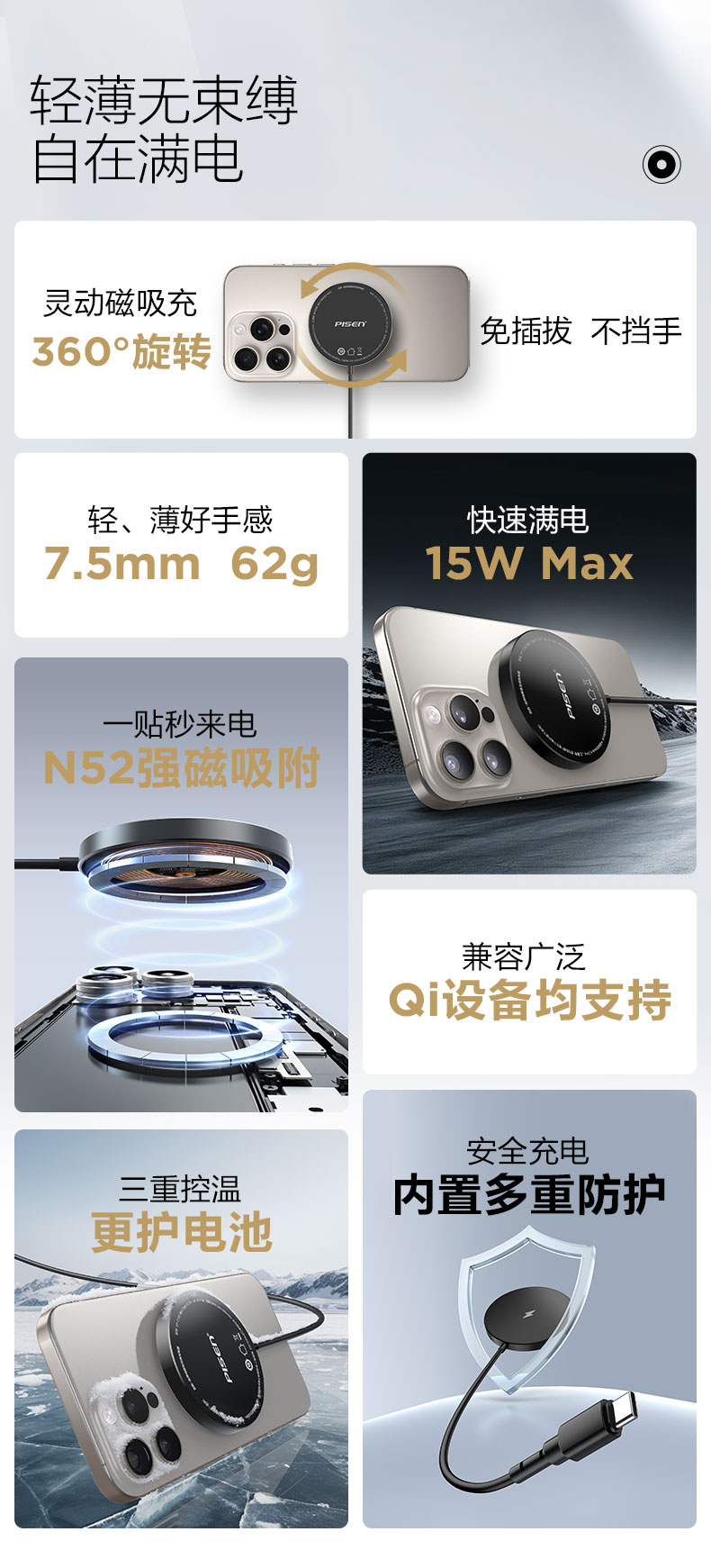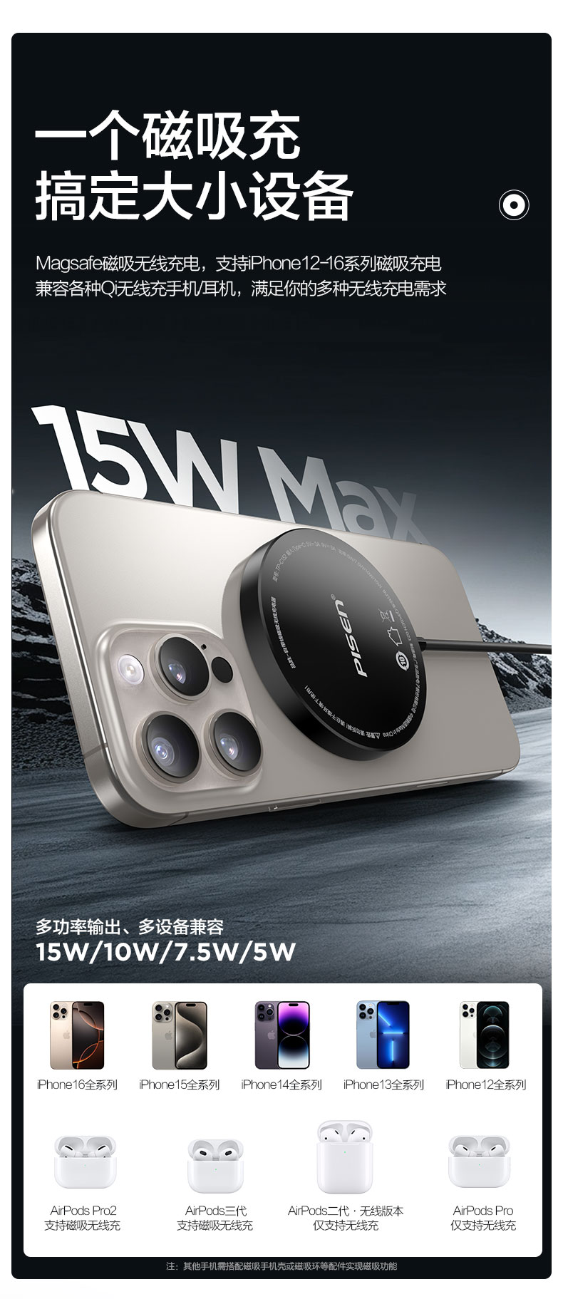 品胜 自带线磁吸无线充电器 Magsafe磁吸快充iPhone16ProMax充电板适用苹果15/14华为小米三星手机充电底座
