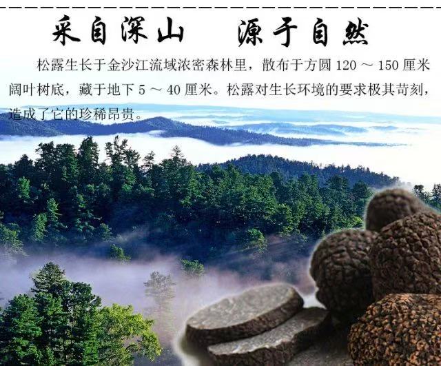 松露对生长环境非常挑剔,只要阳光、水分或者土壤的酸碱值稍微变化就无法生长。中国的松露广泛分布在云川边境一带,即以云南-永仁县和四川-攀枝花为主要产地。永仁的地理、气候和生态环境非常适宜松露繁殖生长,松露年产50吨占全国松露产量的25%,占世界产量的13%。