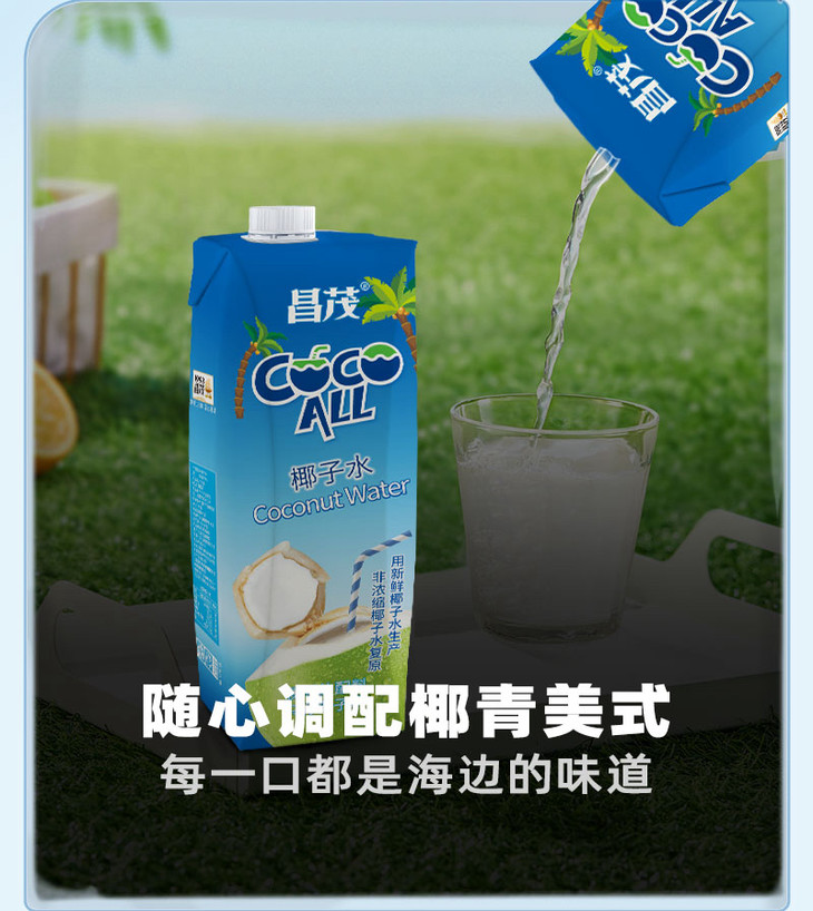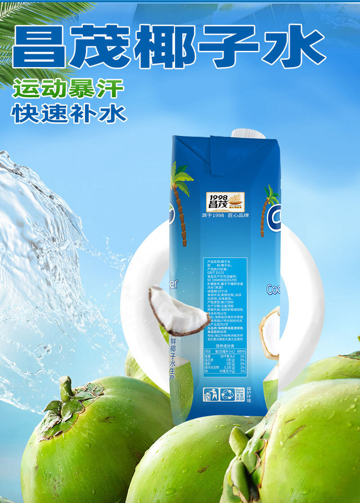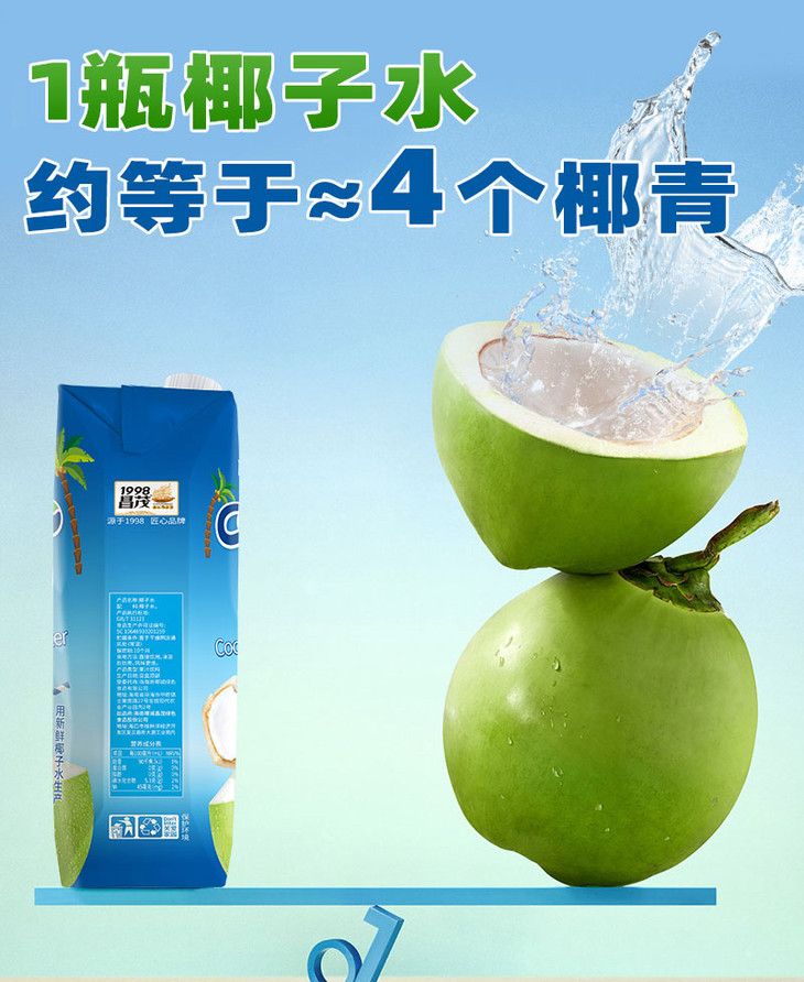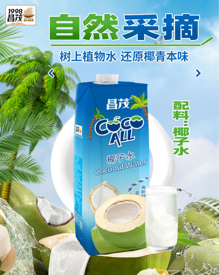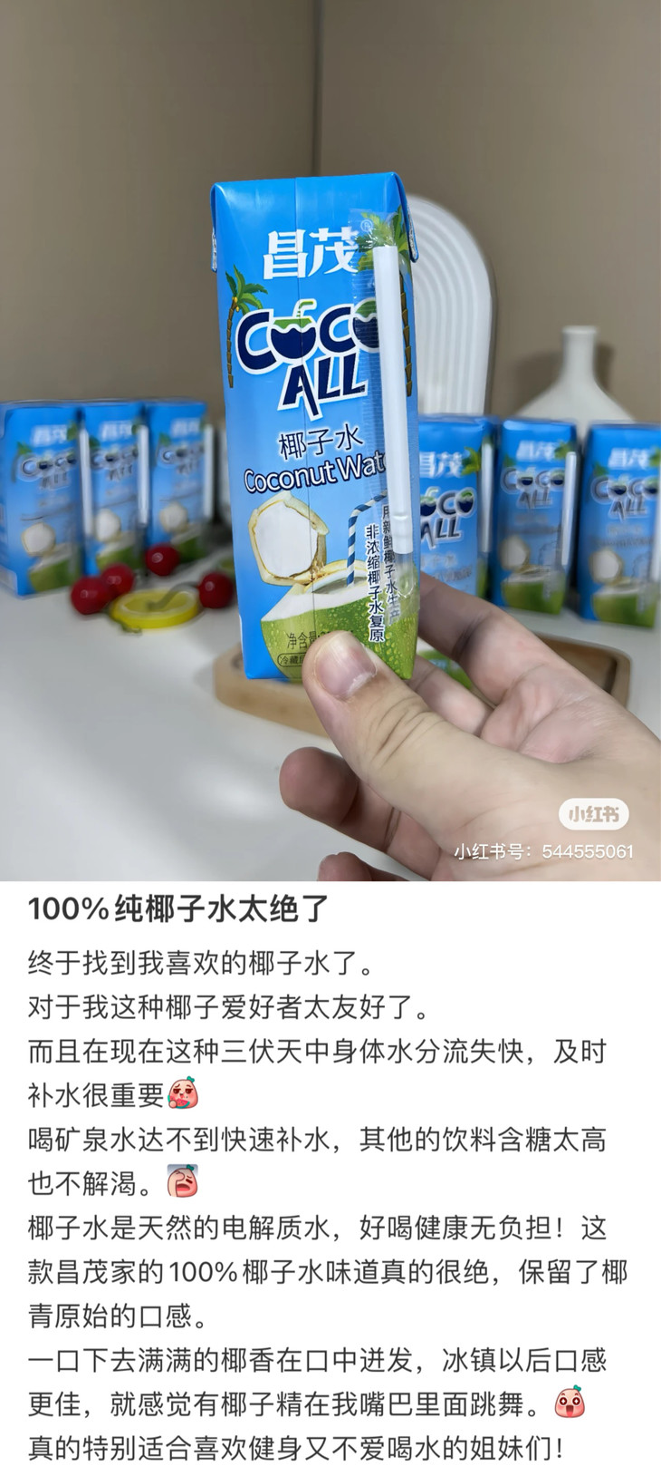 是100%的椰子水哦,没有任何其他,1瓶约等于4个椰青,原汁原味,新鲜好喝,清甜不腻!昌茂采用无菌冷罐工艺,将新鲜原果清洗后开壳出果汁,经瞬间杀菌直接灌装,不经过浓缩及复原,保留了水果原有的热带风味,从树上到口中,完整保留了椰子水的鲜甜,没有怪味和酸涩感,喝起来太快乐啦!