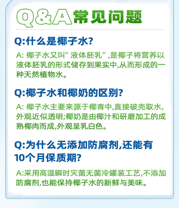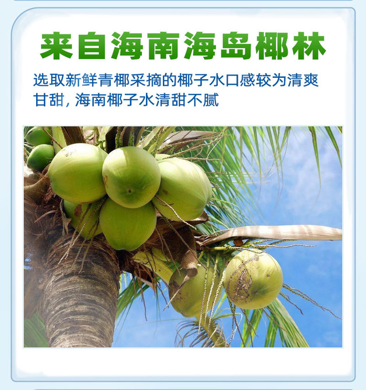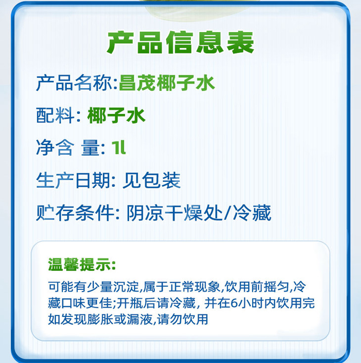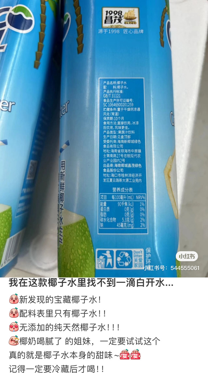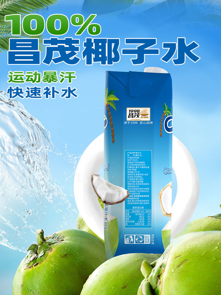 是100%的椰子水哦,没有任何其他,1瓶约等于4个椰青,原汁原味,新鲜好喝,清甜不腻!昌茂采用无菌冷罐工艺,将新鲜原果清洗后开壳出果汁,经瞬间杀菌直接灌装,不经过浓缩及复原,保留了水果原有的热带风味,从树上到口中,完整保留了椰子水的鲜甜,没有怪味和酸涩感,喝起来太快乐啦!