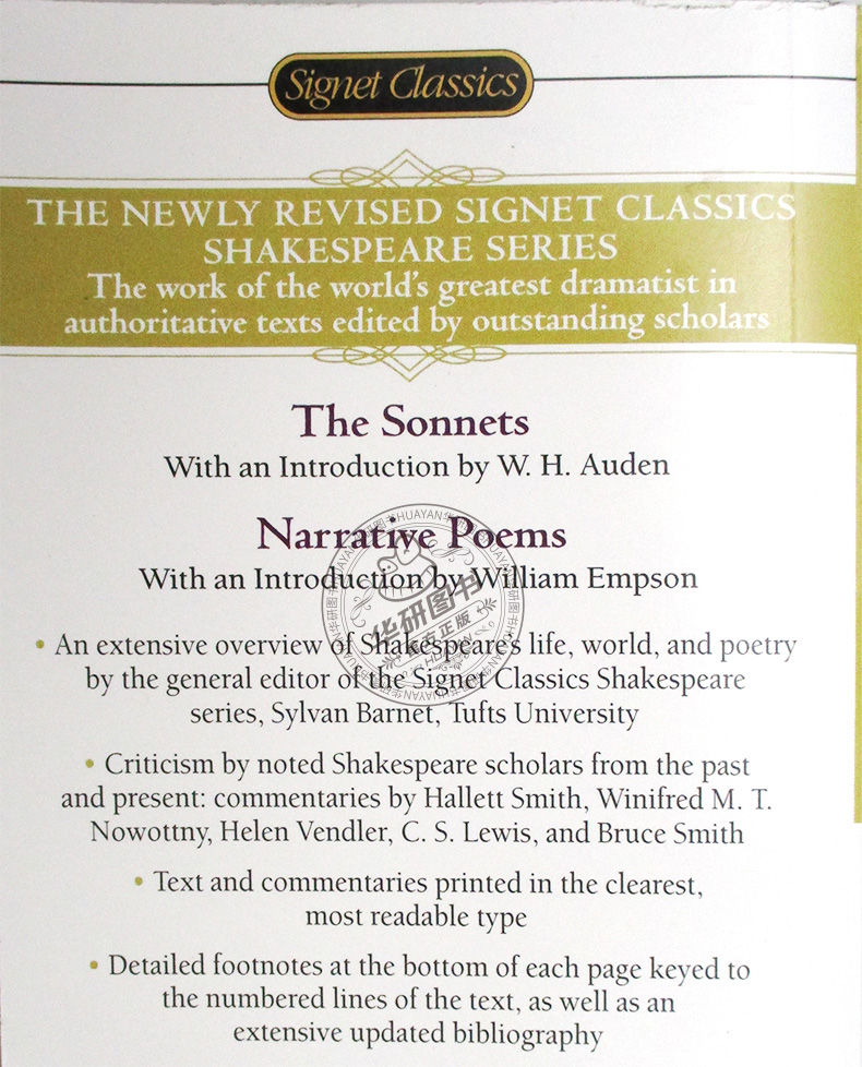 The Sonnets and Narrative Poems《莎士比亚诗歌集:十四行诗及叙事诗》为Signet Classics推出的英文原版诗歌集,收录莎士比亚全部154首十四行诗以及其他叙事诗,另附154首开头句索引表。本书由William Burto和Sylvan Barnet编辑,W. H. Auden作序,内容完整无删减,书本小巧便携。