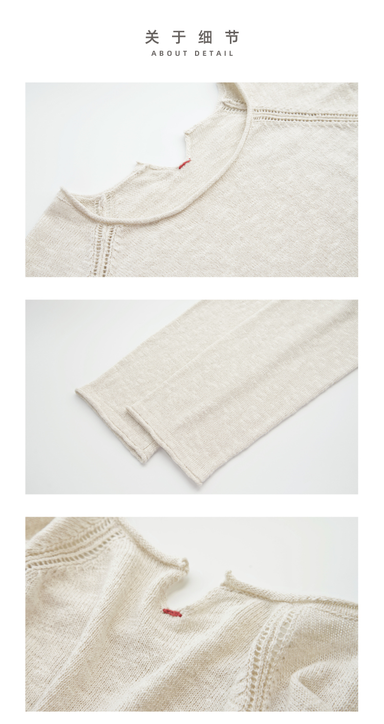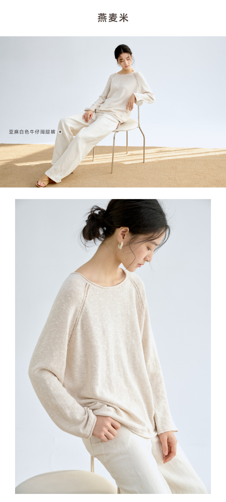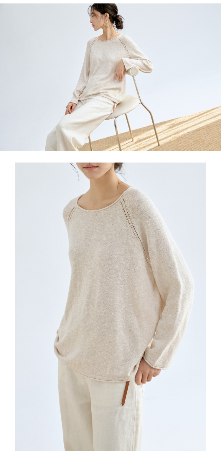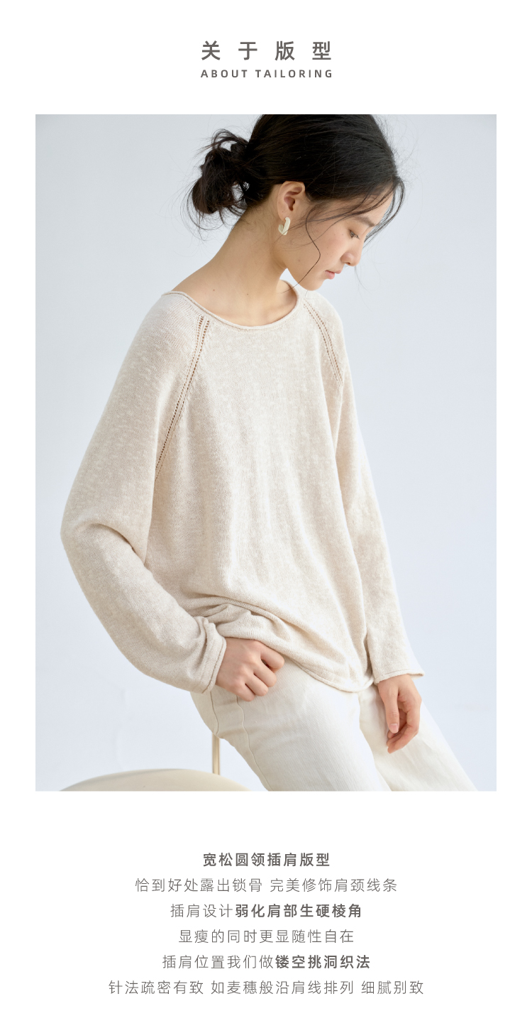 托斯卡纳的艳阳·棉麻丝卷边领镂空插肩长袖针织衫
