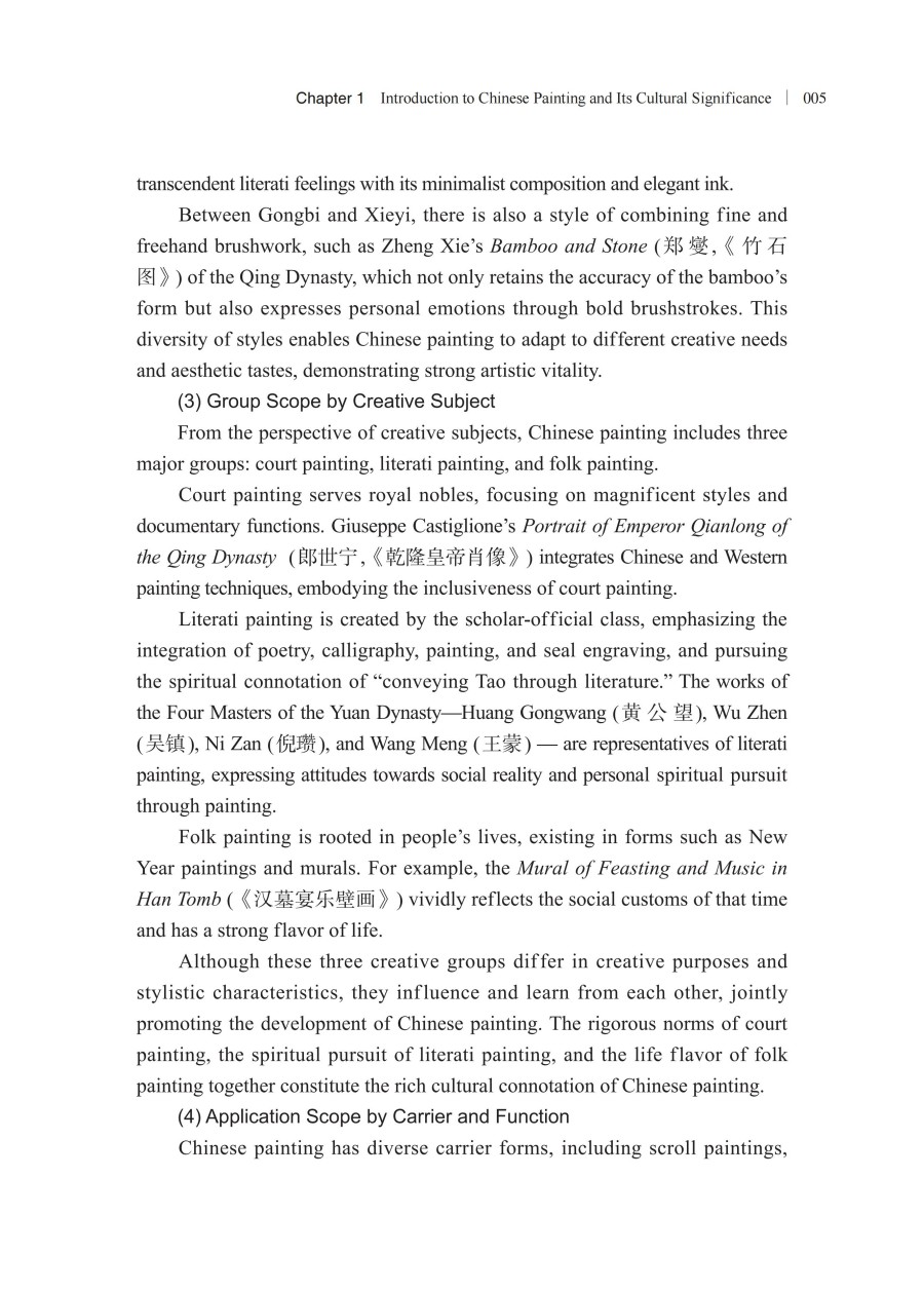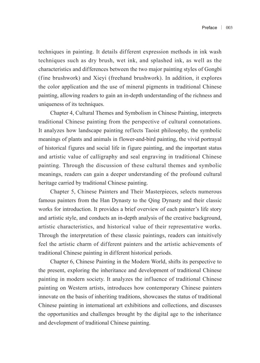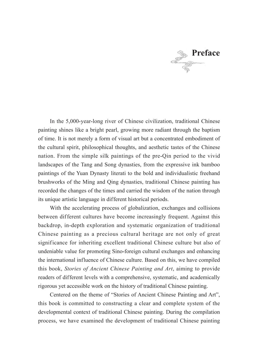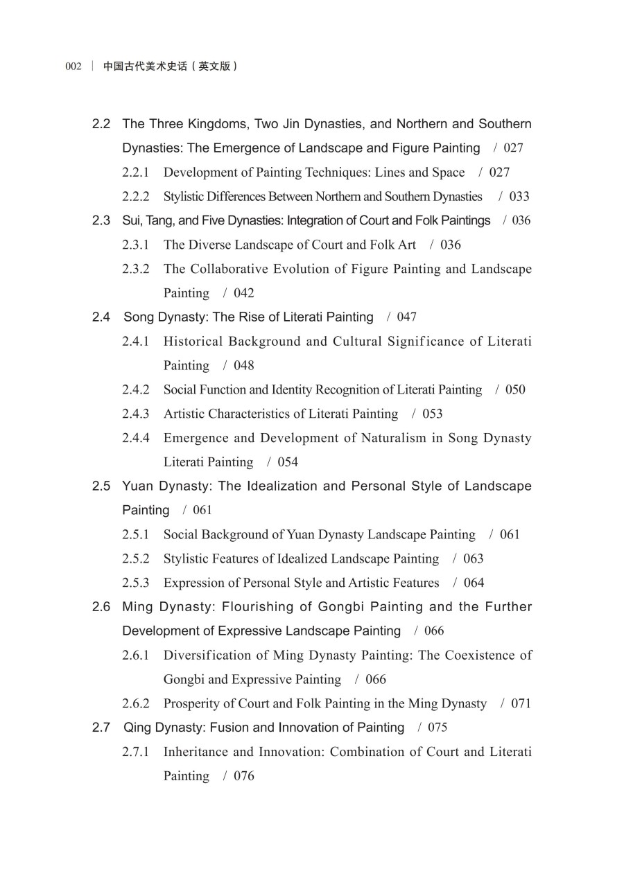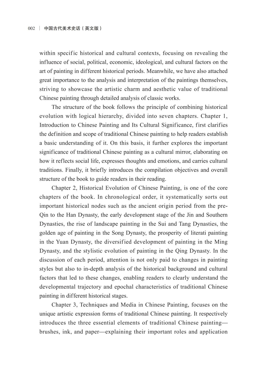 本书系统梳理中国古代美术自起源至明清时期的发展脉络,同时兼顾中国绘画基础知识介绍,全面呈现中国古代美术在不同历史阶段的风貌与成就。本书特点如下。其一,脉络清晰,以时间为序,将各个时期的美术现象置于特定的历史背景中进行解读,帮助读者理解美术发展与社会变迁的紧密联系。其二,内容全面,兼具科普性与专业性,介绍中国美术的基础知识的同时,讲述中国美术的起源与发展、主题与象征、技法与媒介等,展现中国古代美术的多元性。其三,通俗易懂,语言简洁明了,避免过多专业术语的堆砌,同时配以丰富的案例介绍和分析,让读者能轻松走进中国古代美术的世界。本书以英文为载体,在对大量史料进行梳理和分析基础上撰写本书。在论述不同时期美术发展时,适当挖掘美术作品中蕴含的文化内涵和精神价值,将美术史与文化发展相结合,为读者呈现一个更为立体、丰富的中国古代美术图景。
