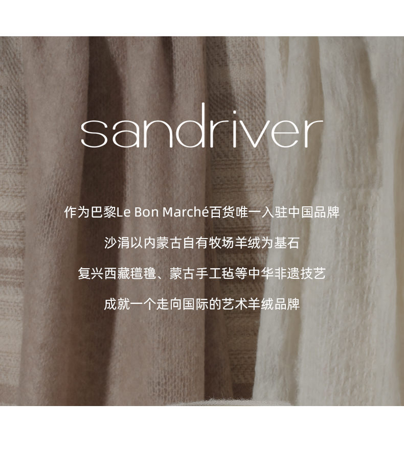 - 历年在巴黎时装周亮相,享誉世界的艺术羊绒品牌[Sandriver 沙涓]由羊绒布道者郭秀玲女士创立。阿拉善自有牧场纯种羔羊绒,日本国宝设计师小筱顺子,上海自有基地精工细作。承载羊绒情怀,坚持匠人品质。
