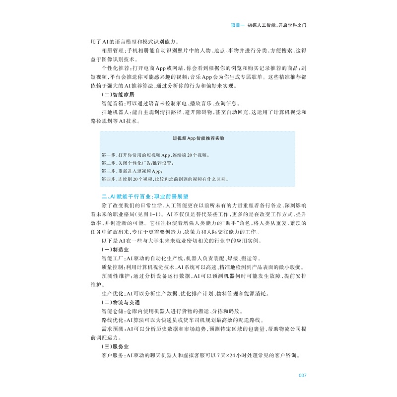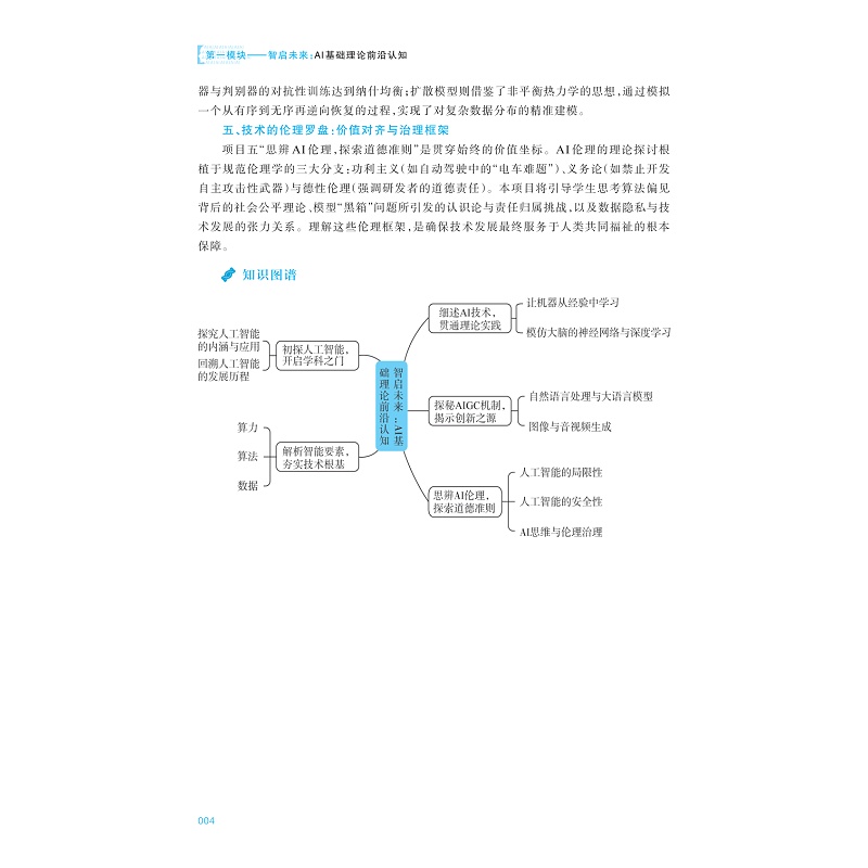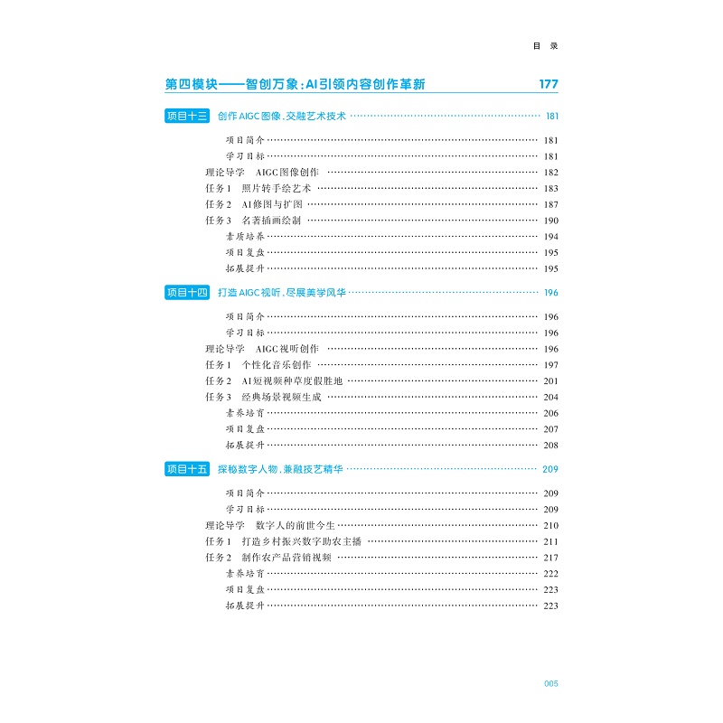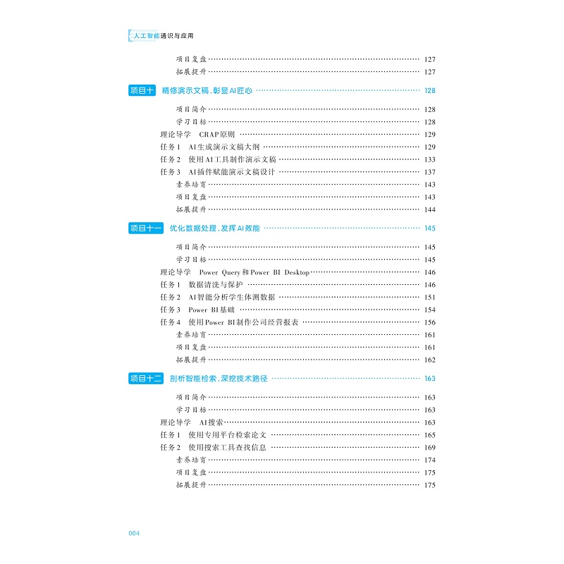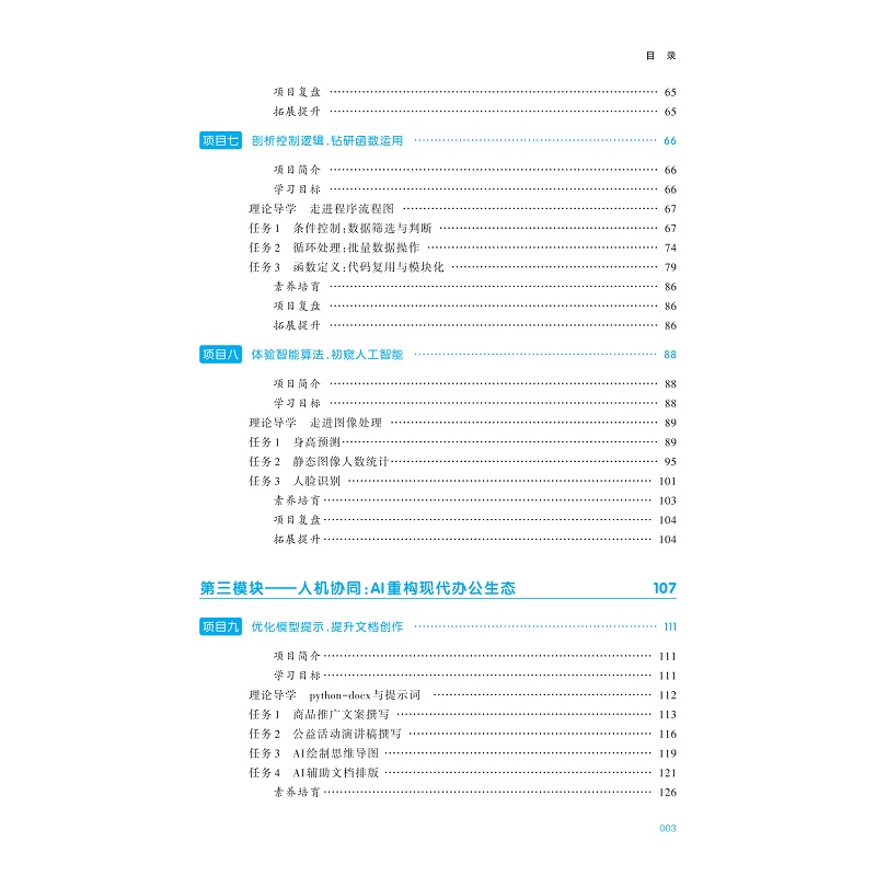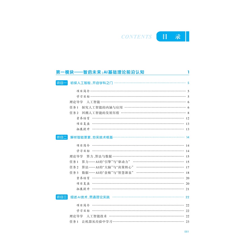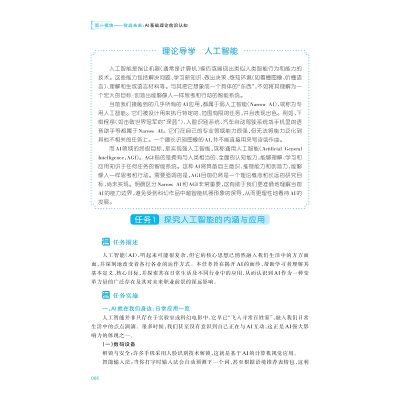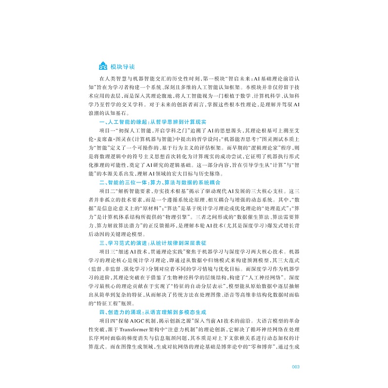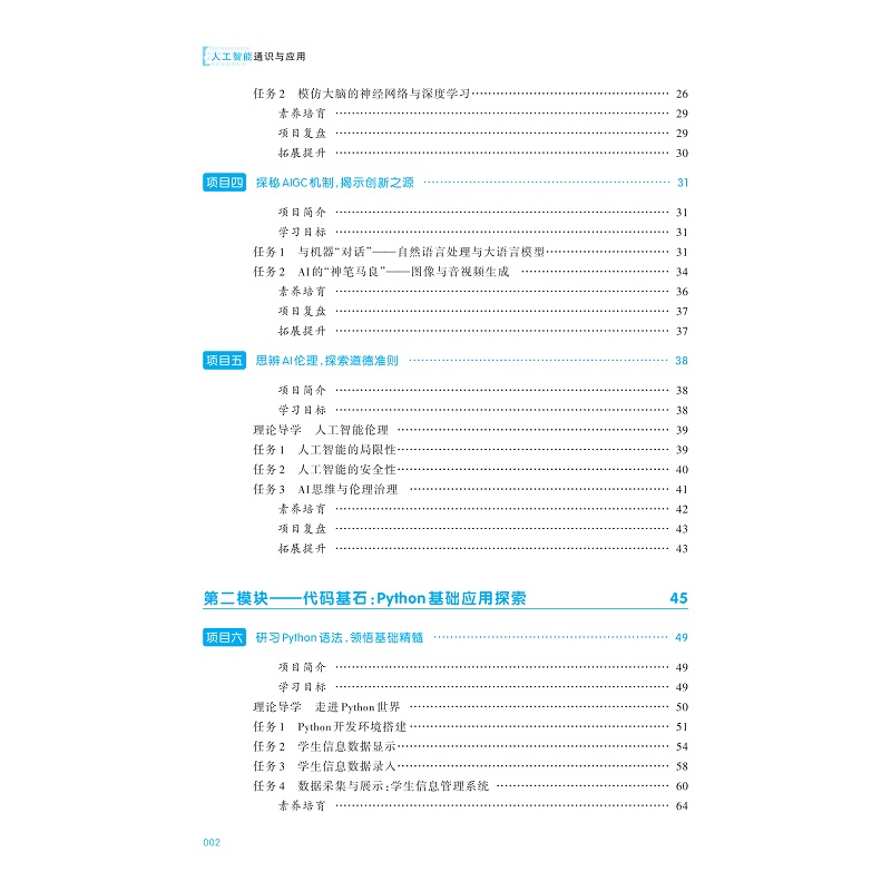 为提升职业院校大学生的人工智能素养,基于“教、学、做、评”一体化的教学理念,采用项目化思想,以活页式教材形式编写。立足人工智能技术体系、产业应用和岗位技术技能要求,本书内容分为五大知识模块,包括AI基础理论前沿认知、Python 基础应用探索、AI引领内容创作革新、AI重构现代办公生态、AI驱动行业革新实践。根据学生专业不同,教学内容主要分为理工农医和人文艺术两大类,不同专业的学生可以根据自身专业的特点选择不同的模块进行弹性组合。本书共有40个项目,从贴近学生生活的实例设计学习任务,强调知识性、技能性和应用性的紧密结合。