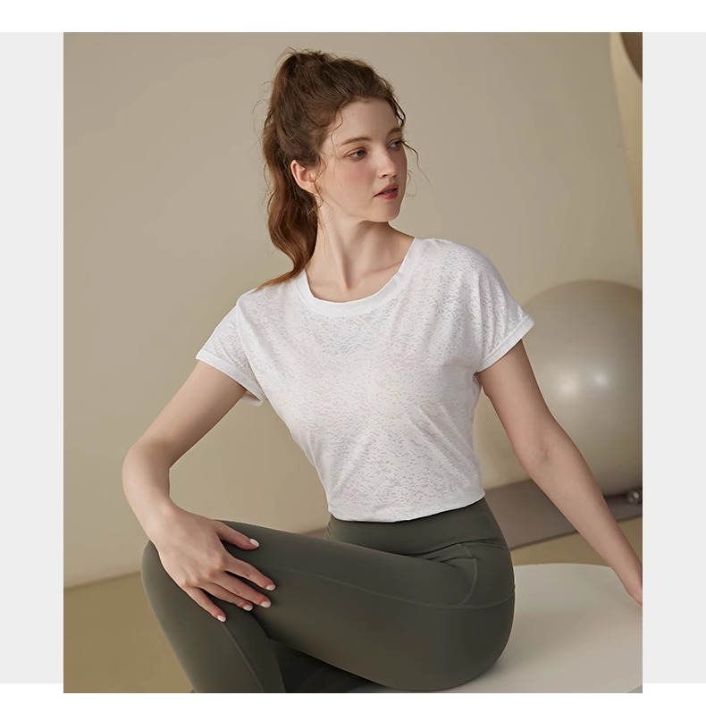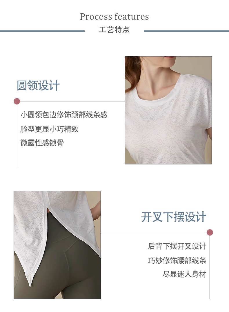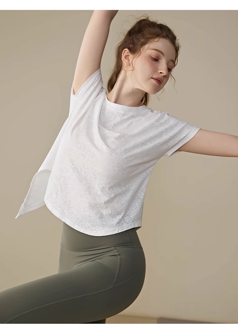 跃牌【美西西系列】普拉提训练服夏轻薄运动健身服提花开衩罩衫女短袖DX-233
