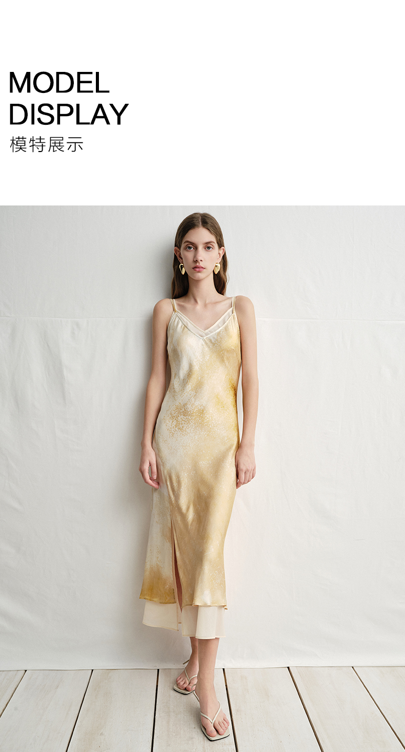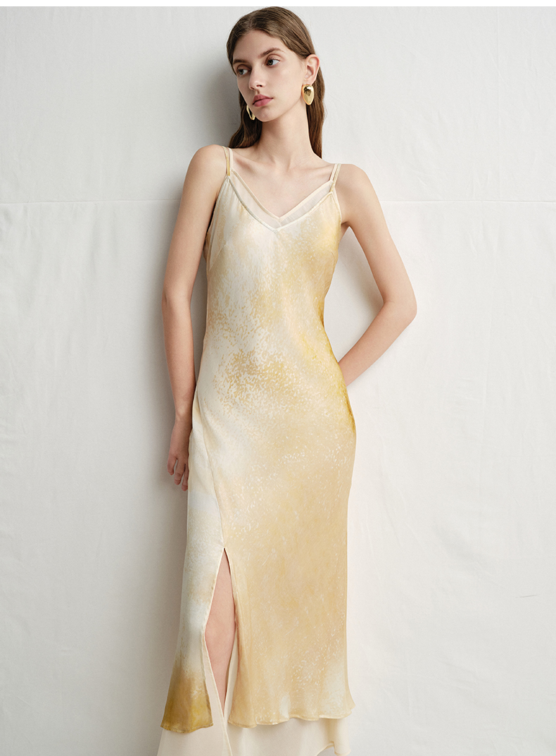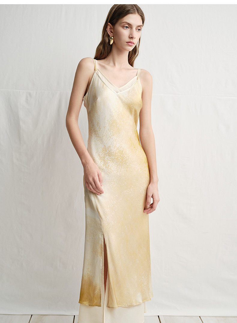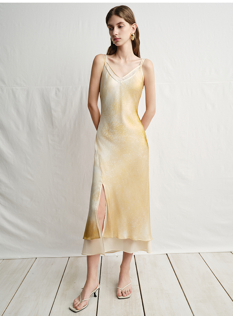 VIMAGE纬漫纪2025夏季新款设计感晕染印花高级V领修身显瘦吊带连衣裙V2377908