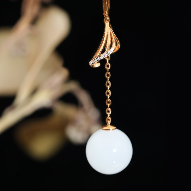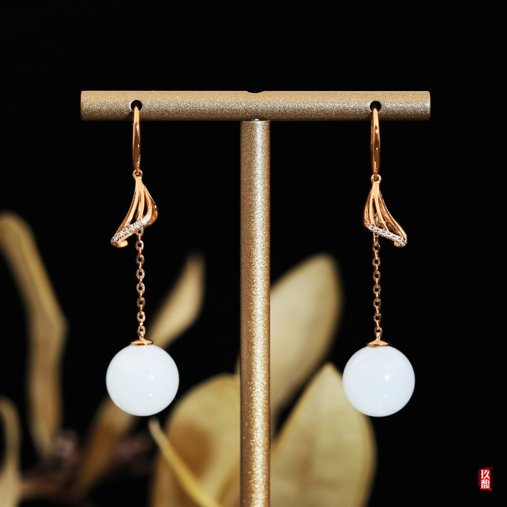 18K玫瑰金和田玉(白玉)镶钻玉珠耳饰