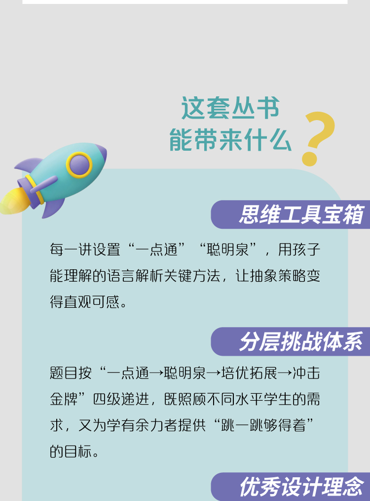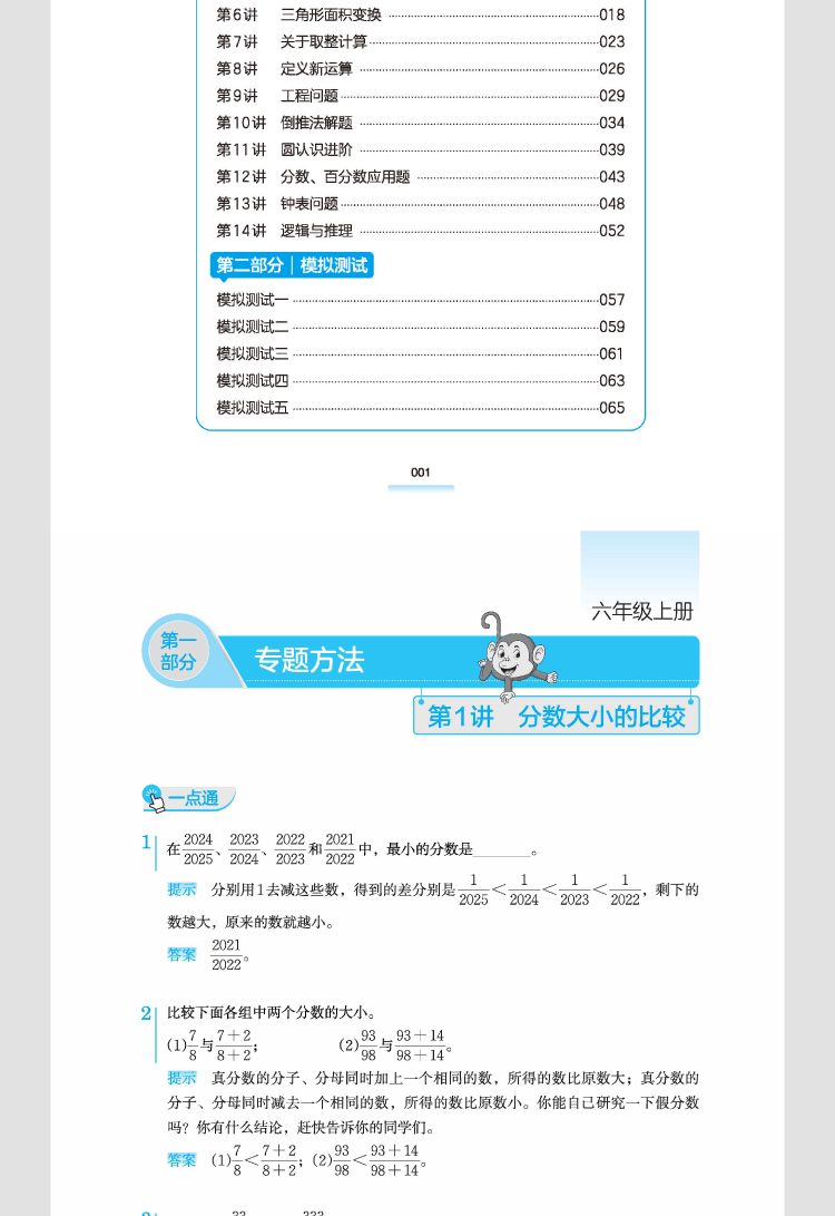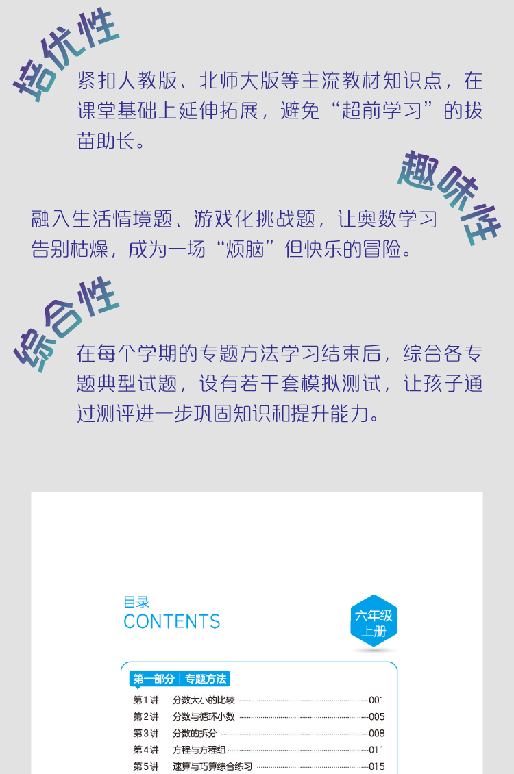 本书内容渗透了各地数学竞赛题的解题方法,突出培养学生的思维能力和逻辑推理能力,从而培养学生学习数学的兴趣。本书的特色有:1.不超出课程标准的要求,注重在教材、课堂学习的基础上适当补充和加深,启发学生灵活运用知识。2.不超前学习,进度与平时教材学习基本保持一致,并且尽可能与课堂教学配合。3.力求讲透内容,练习题量少而精,着重训练思维方法和能力,旨在让学生真正学到一点有用的思路、方法和技巧。4.趣味性强,很多题目能丰富学生的课外知识。