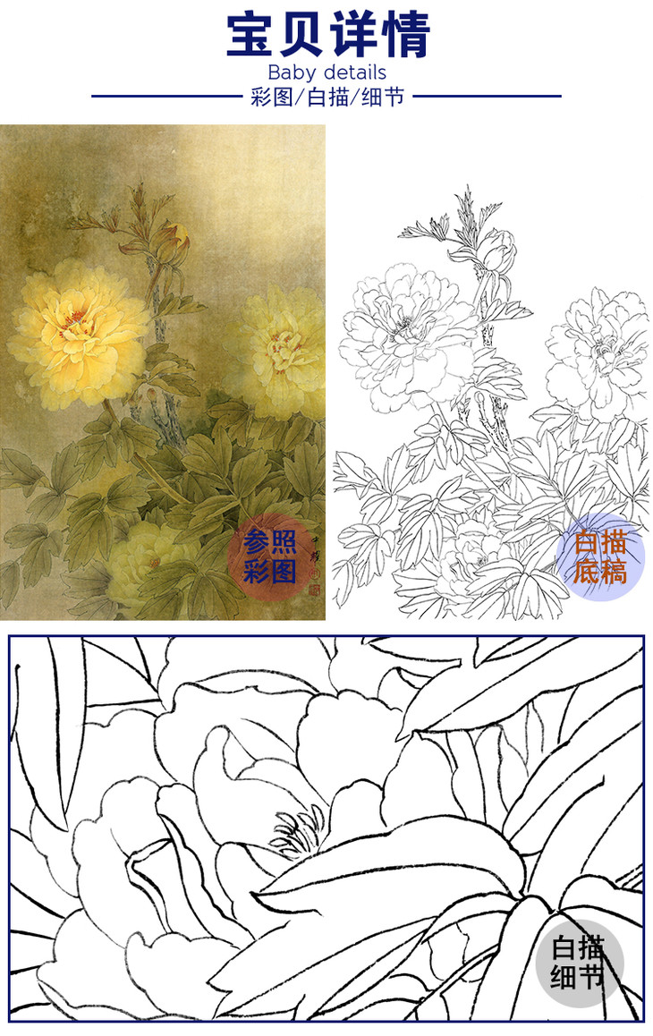 竖幅工笔花鸟白描底稿-周中耀-牡丹《梦随庄生入洛阳》-多种白描尺寸可选-ZT06