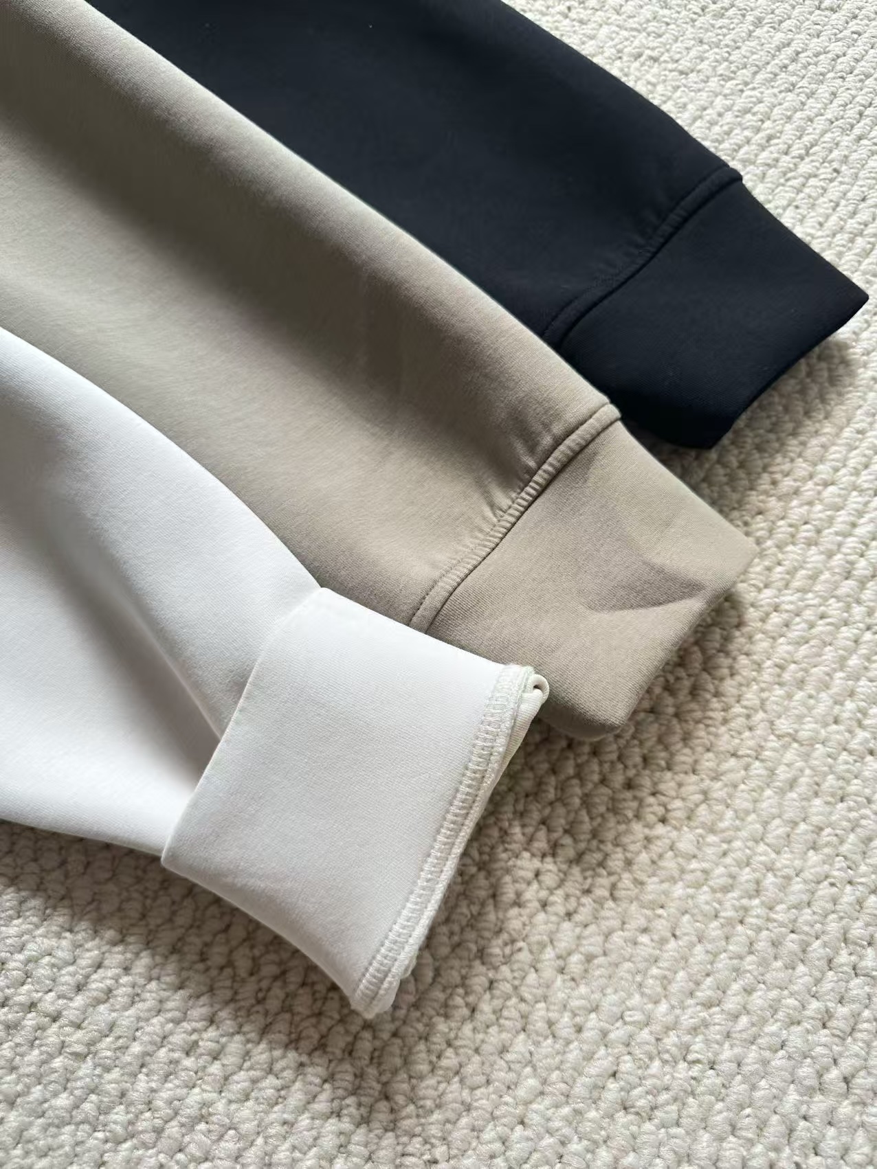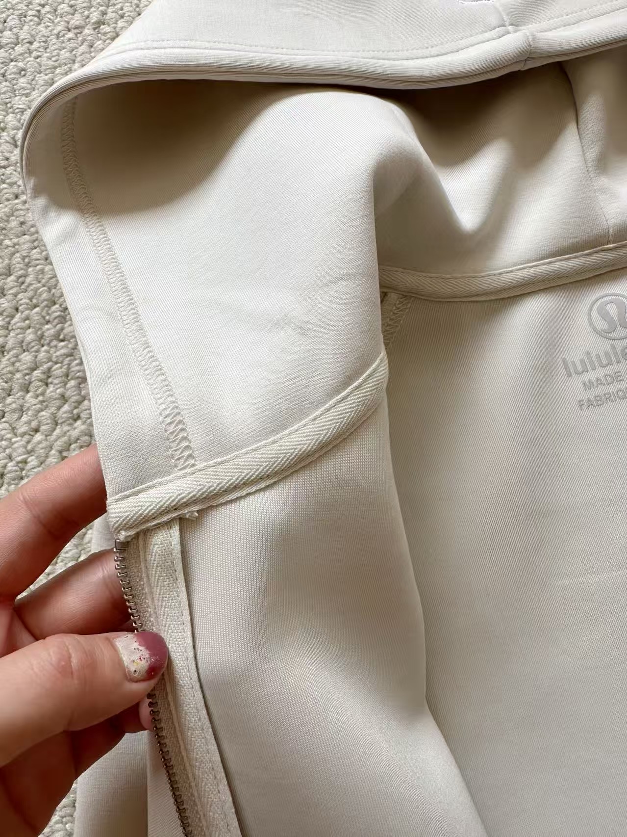 领口采用人字带包边加固,肌理质感自然独特,有效防止变形。