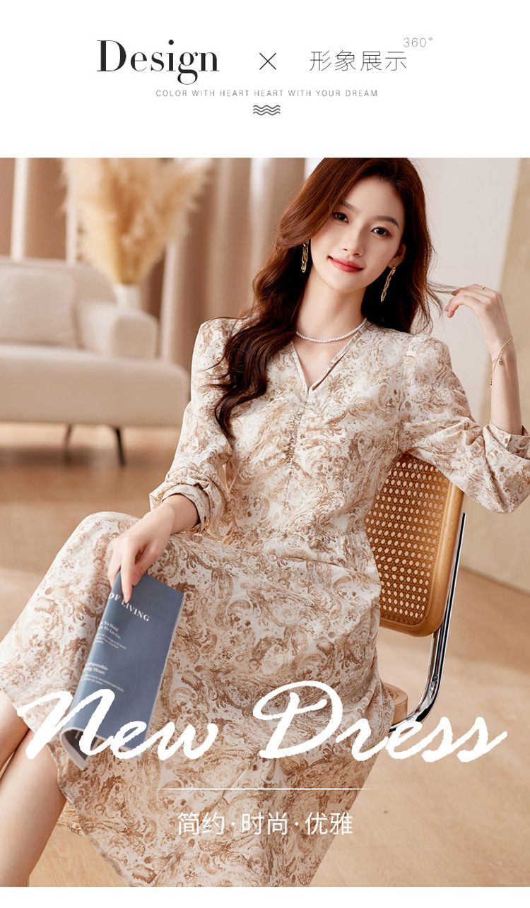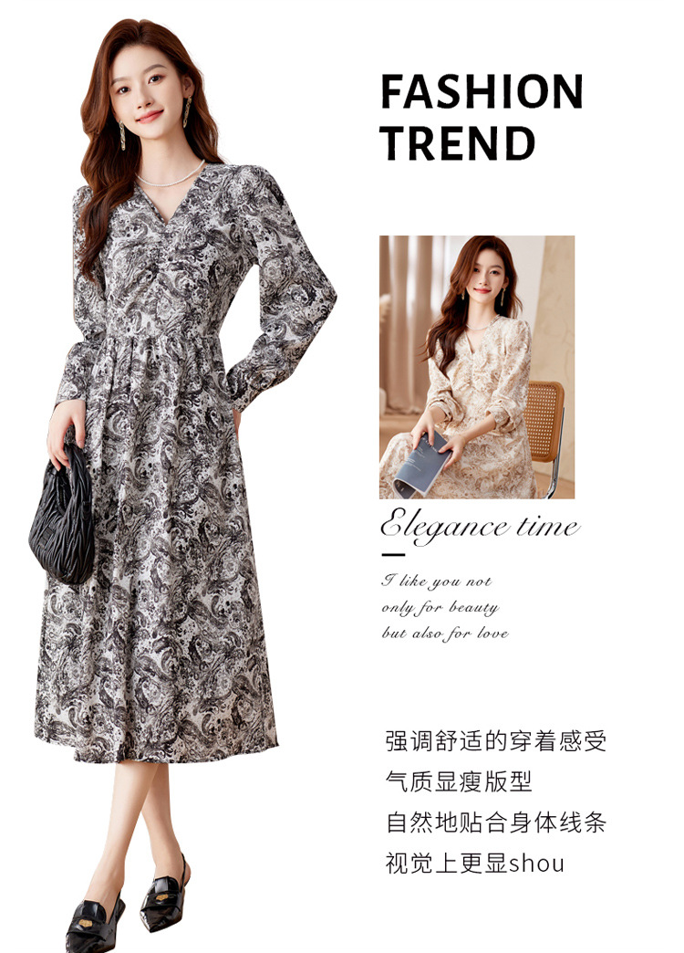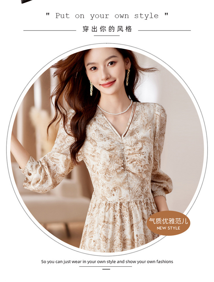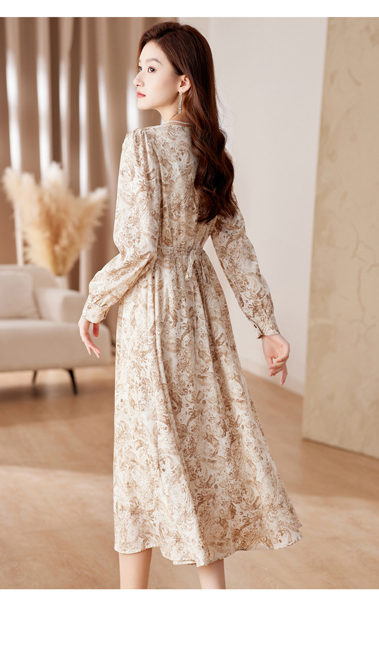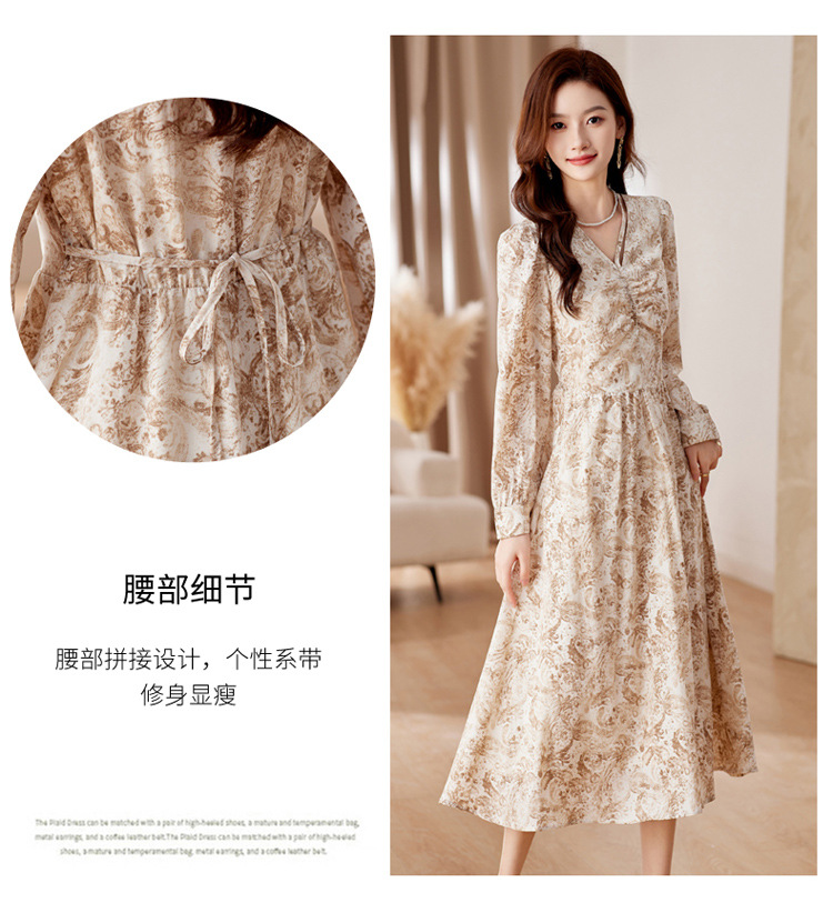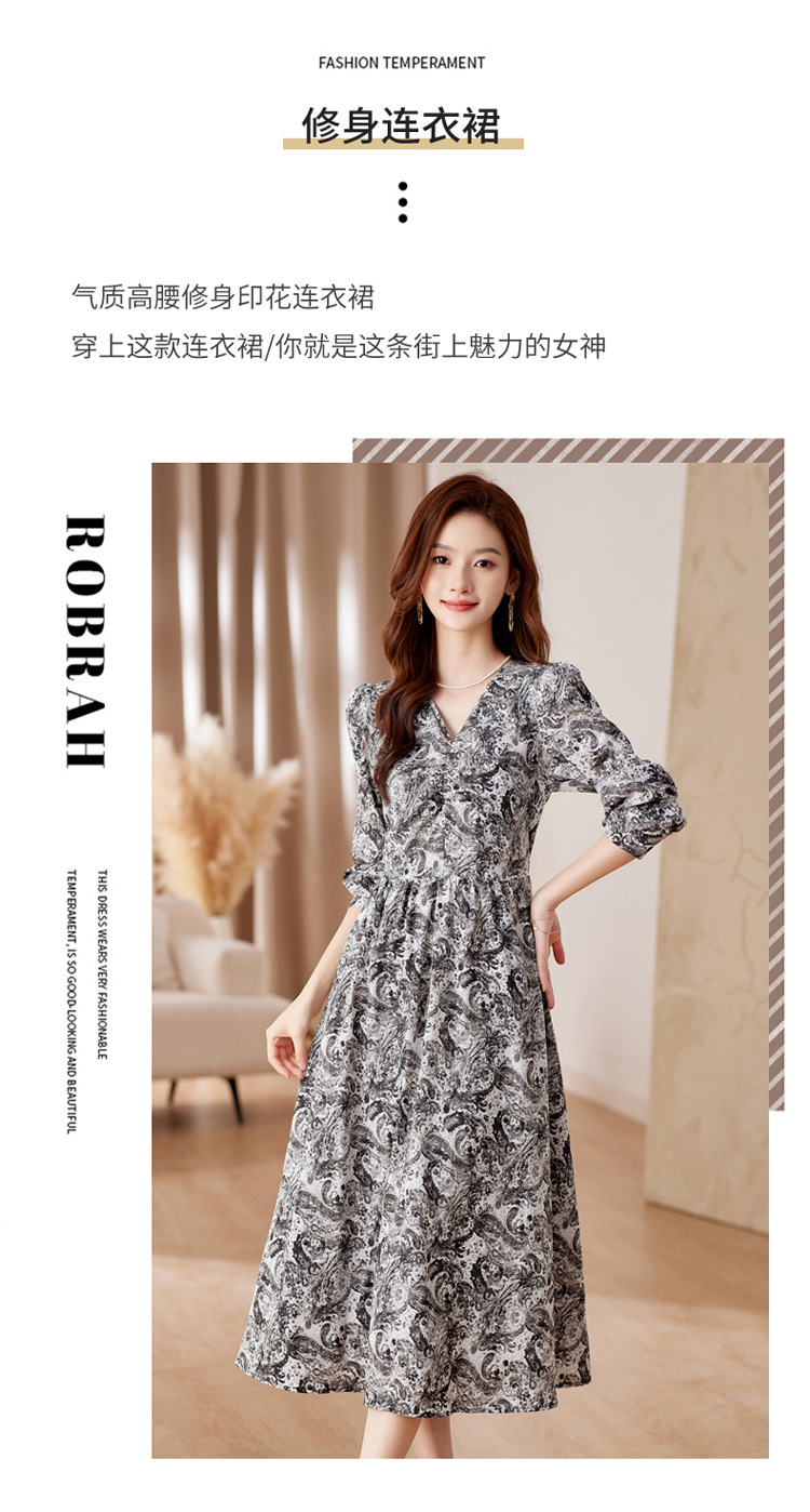 HR-WA23759秋季上新气质时尚优雅温柔风系带印花收腰显瘦高腰A字连衣裙