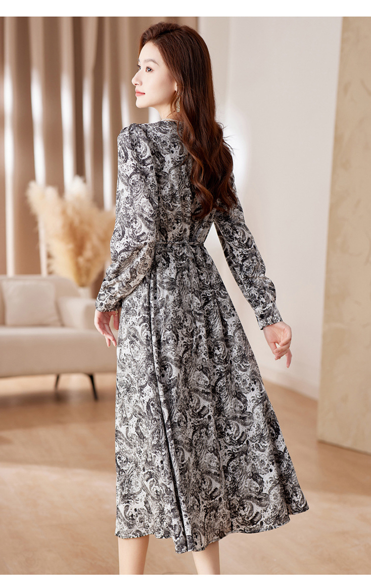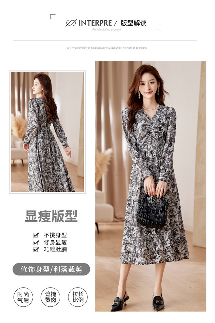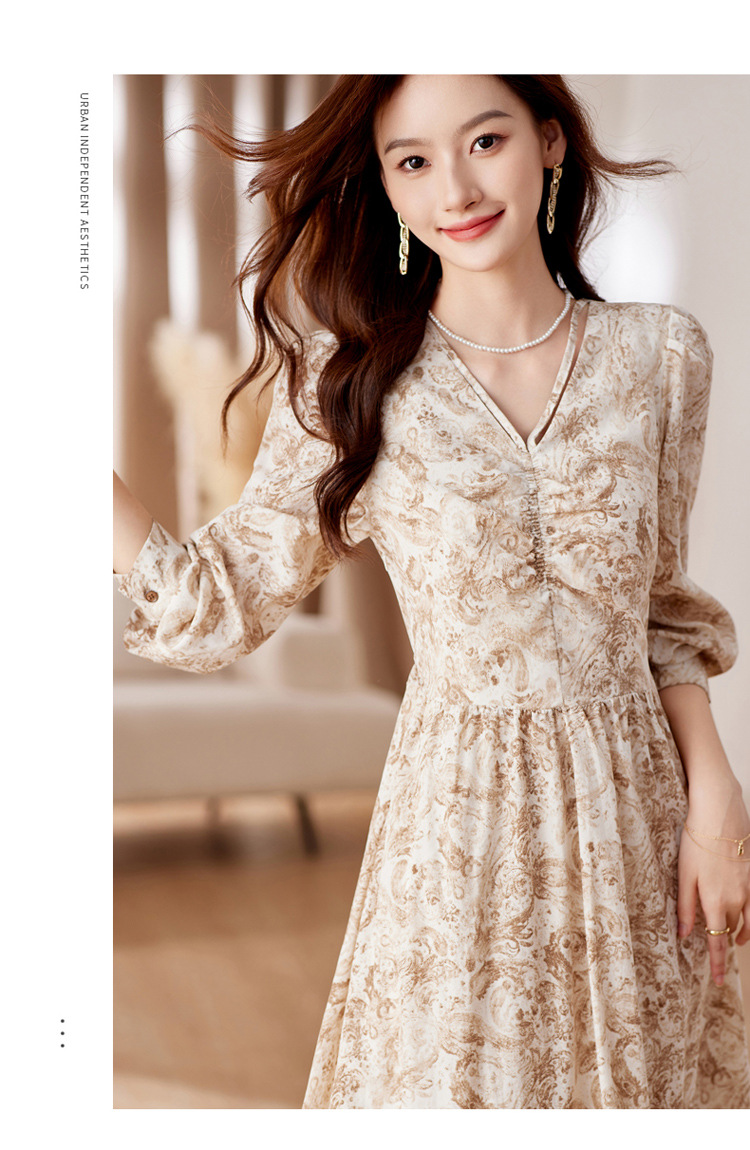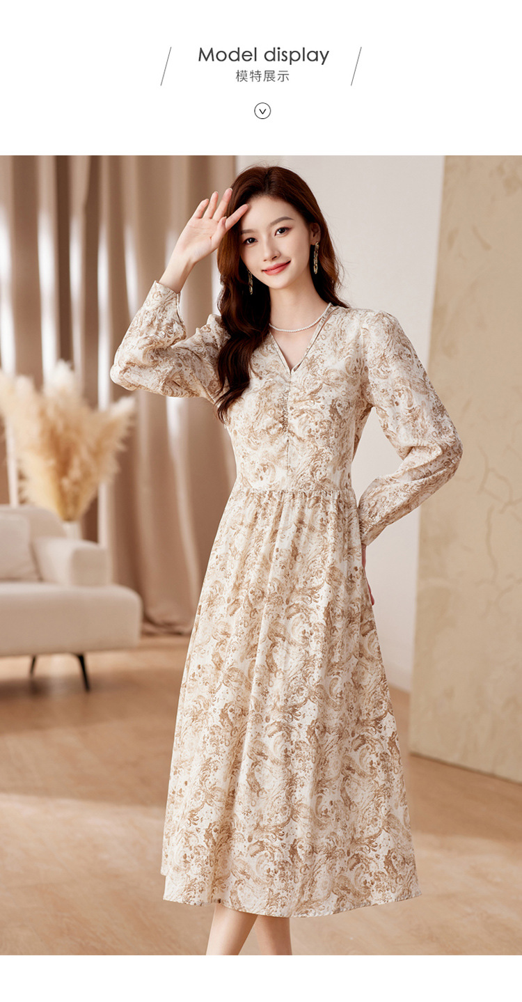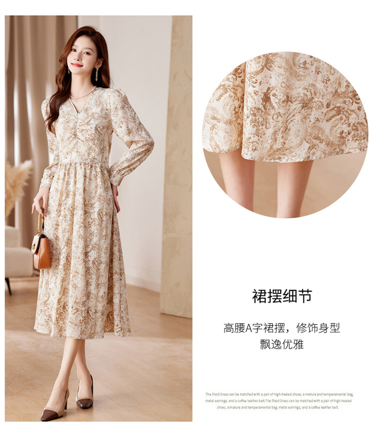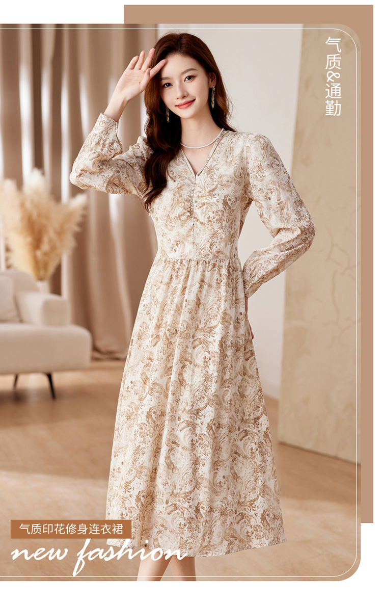 HR-WA23759秋季上新气质时尚优雅温柔风系带印花收腰显瘦高腰A字连衣裙