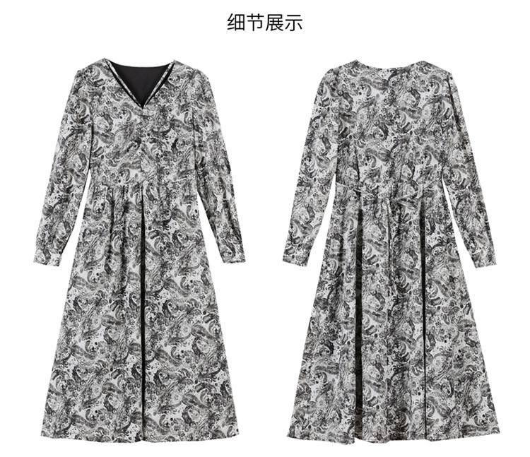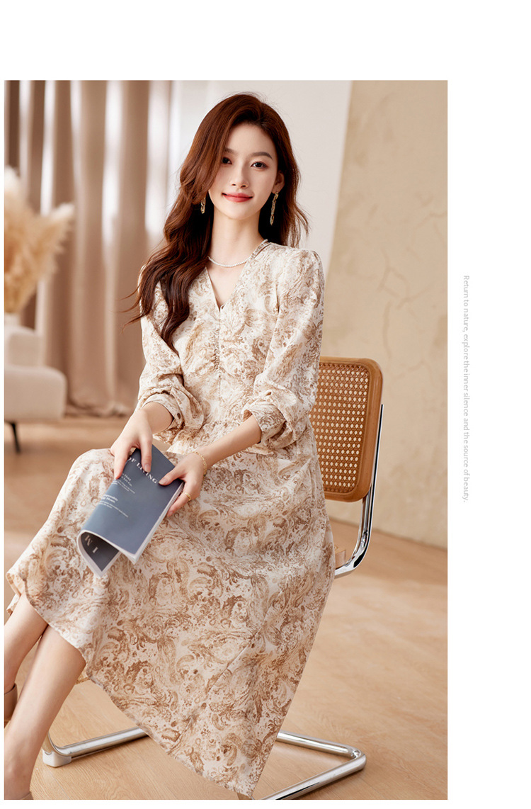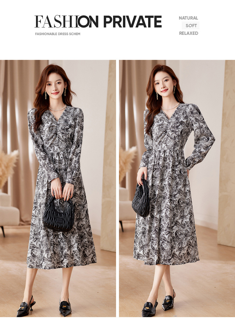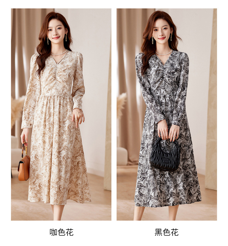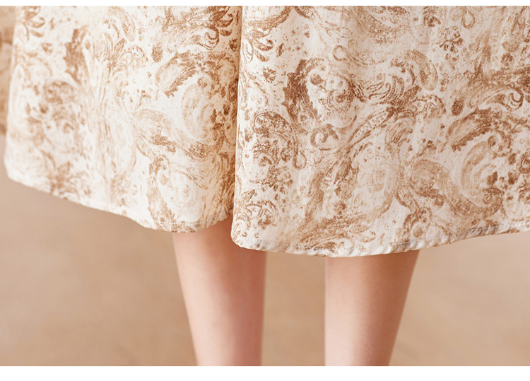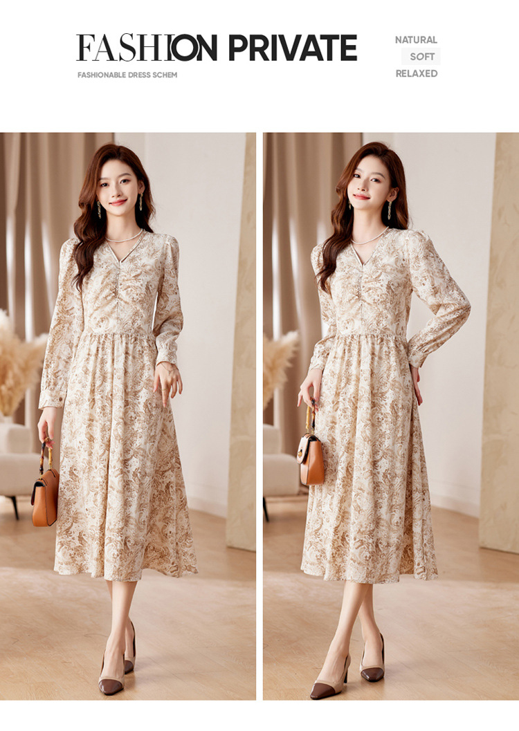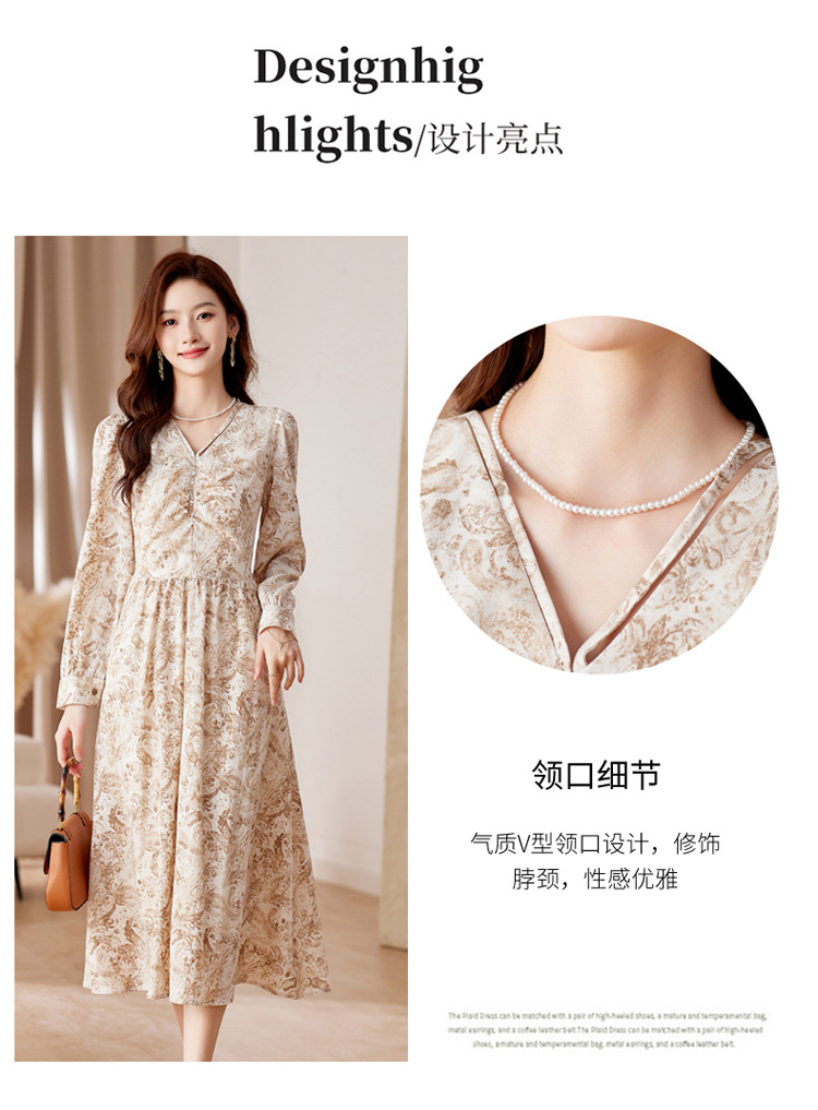 HR-WA23759秋季上新气质时尚优雅温柔风系带印花收腰显瘦高腰A字连衣裙