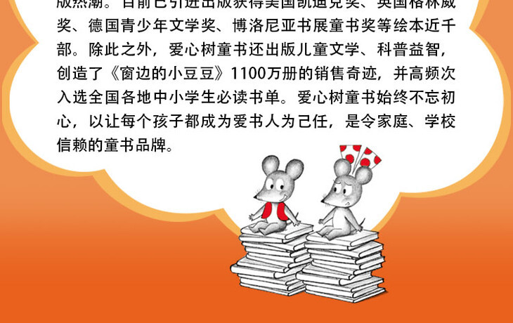 2004年,“可爱的鼠小弟”漂洋过海来到中国,被无数家长和孩子同时接纳和喜爱,2005年评为全国童书排行榜top1,获得包括《人民日报》在内的诸多主流媒体、专业阅读推广机构的认可和推荐,入选中国儿童分级阅读书目、中国幼儿基础阅读书目等。目前,“可爱的鼠小弟”销量已超过1200万册,长期位列各大网站童书畅销榜单,已是名副其实的儿童***绘本。