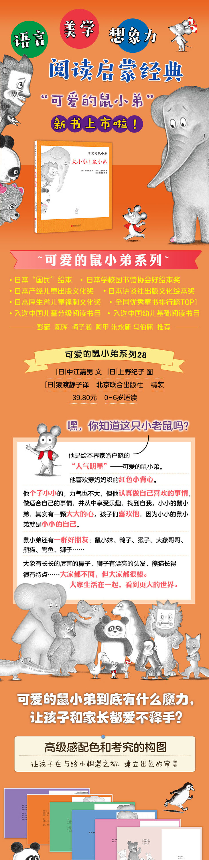 “可爱的鼠小弟”系列是日本绘本作者中江嘉男和上野纪子合著的不朽经典,自1974年诞生以来,斩获日本各大童书奖项——日本学校图书馆协会好绘本奖、日本产经儿童出版文化奖、日本讲谈社出版文化绘本奖、日本厚生省儿童福利文化奖,堪称日本“国民绘本”。