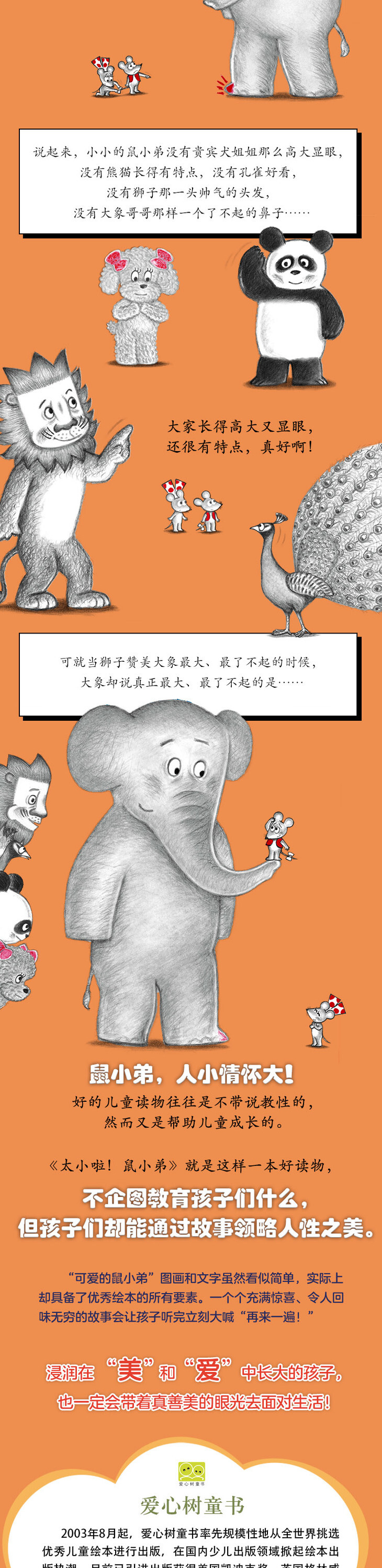 大象哥哥被石头绊了一下,不小心踩到鼠小弟的尾巴。善解人意的鼠小弟没有责怪大象哥哥,反而开导他是自己太小了,不容易被看到。说起来,小小的鼠小弟没有贵宾犬姐姐那么高大显眼,没有熊猫长得又特点,没有孔雀好看,没有狮子那一头帅气的头发,没有大象哥哥那样一个了不起的鼻子……可就当狮子赞美大象又大又了不起的时候,大象却说真正了不起的是鼠小弟。这是为什么呢?