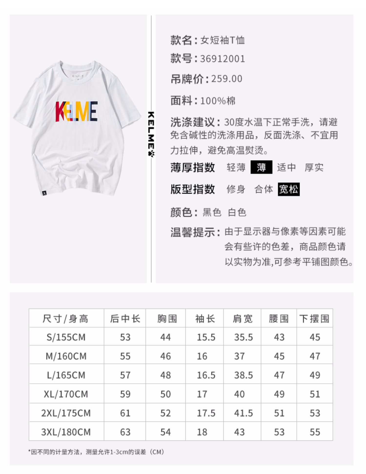 KELME 卡尔美 夏装韩版时尚ins宽松t恤字母纯棉短袖休闲上衣女潮