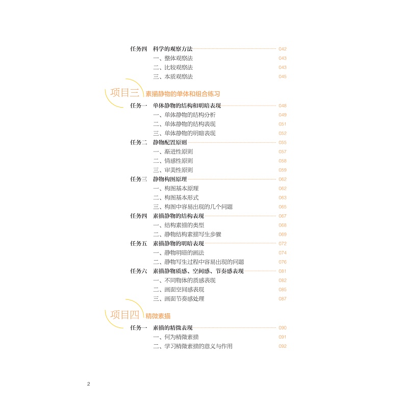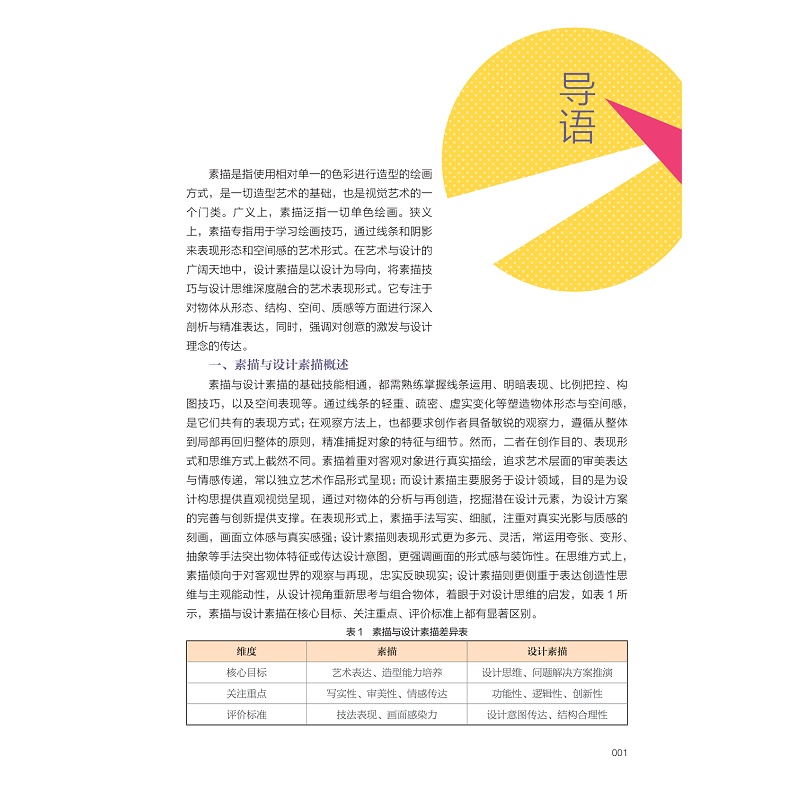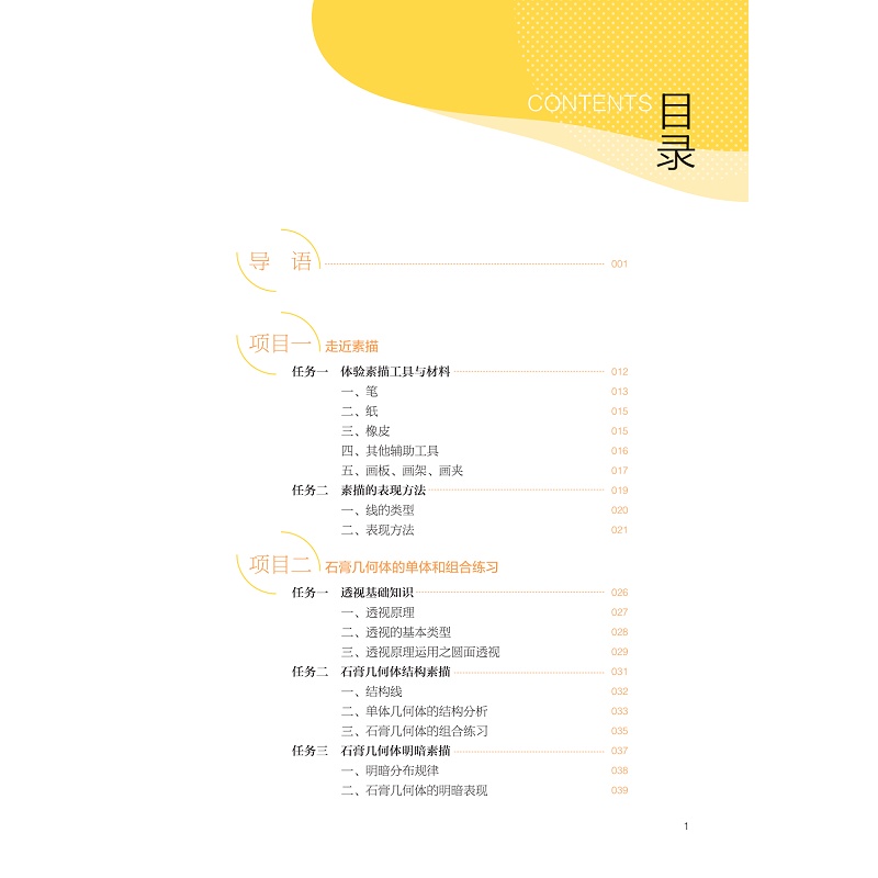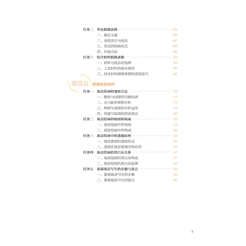 本教材以“项目”为纲,“任务”为目进行编排,通过简化理论知识,强调技能技法掌 握,在视觉、思维、动手能力的协调训练中激发创新思维,点燃创造的火花,为艺术设计专业打下坚实基础。绪论部分论述了素描与设计素描之间的关系,各项目中的任务主要安排了熟悉操作流程和技能技法运用,为有效培养中高职一体化贯通的技能人才奠定了基础。教材共分“绪论”“走近素描”“石膏几何体的单体和组合练习”“素描静物的单体和组合练习”“精微素描”和“素描场景创作”六块内容,除绪论外,每个项目都包含若干任务,由“任务描述、任务准备、任务实施、任务拓展、知识链接和任务延伸”六个部分组成,逻辑严密、条理清晰。